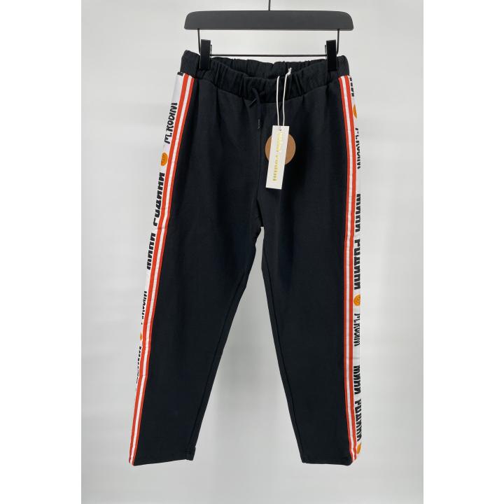Zwarte trainingsbroek van Mini Rodini in maat 140 / 146 met elastische tailleband en koordje. Langs beide zijkanten zit een baan met de tekst ‘Mini Rodini’…