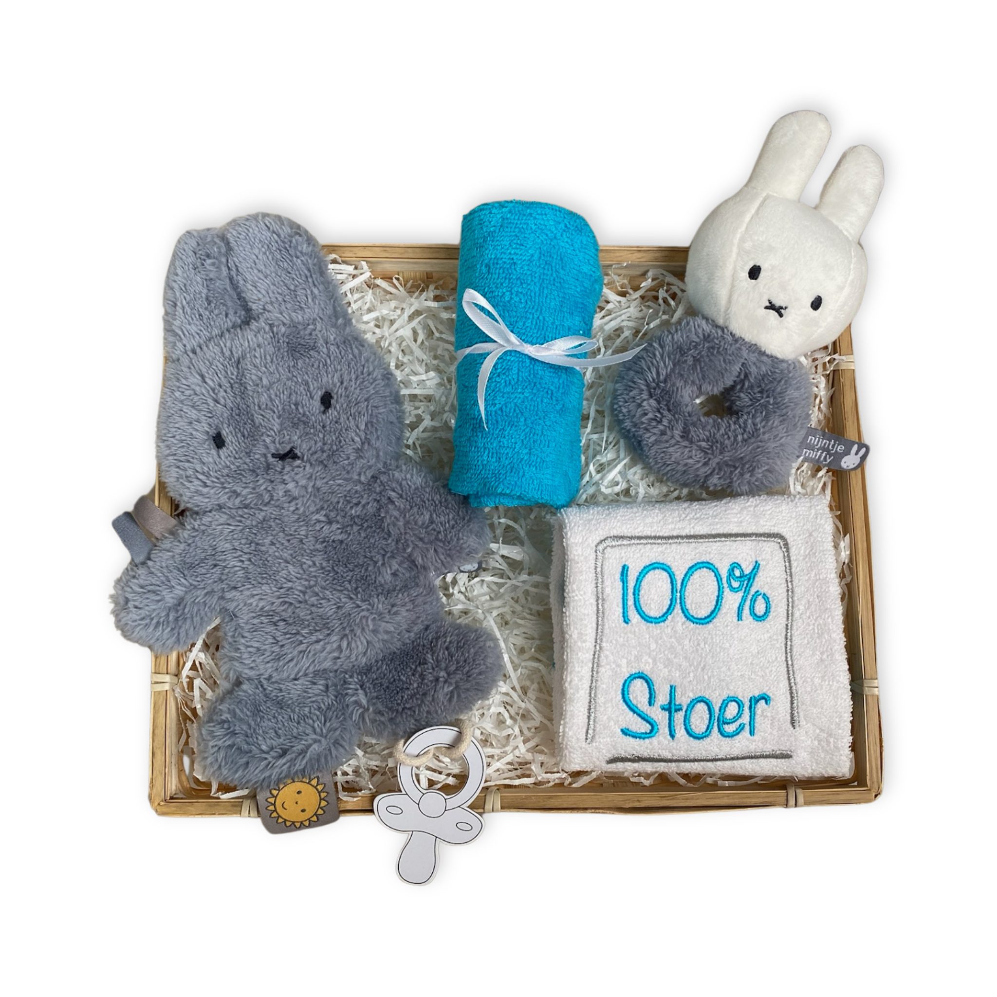Deze leuke giftset van Nijntje bestaat uit een blauw Nijntje speendoekje en rammelaar gemaakt van zachte fluffy stof; heerlijk om mee te knuffelen! Daarnaast voegen we een slabbetje met de tekst: ‘100% stoer’ aan de giftset toe. Heel handig wanneer de eerste hapjes in het rond gaan vliegen. Een altijd handig spuugdoekje maakt het cadeau helemaal compleet. Deze kun je nooit genoeg hebben!