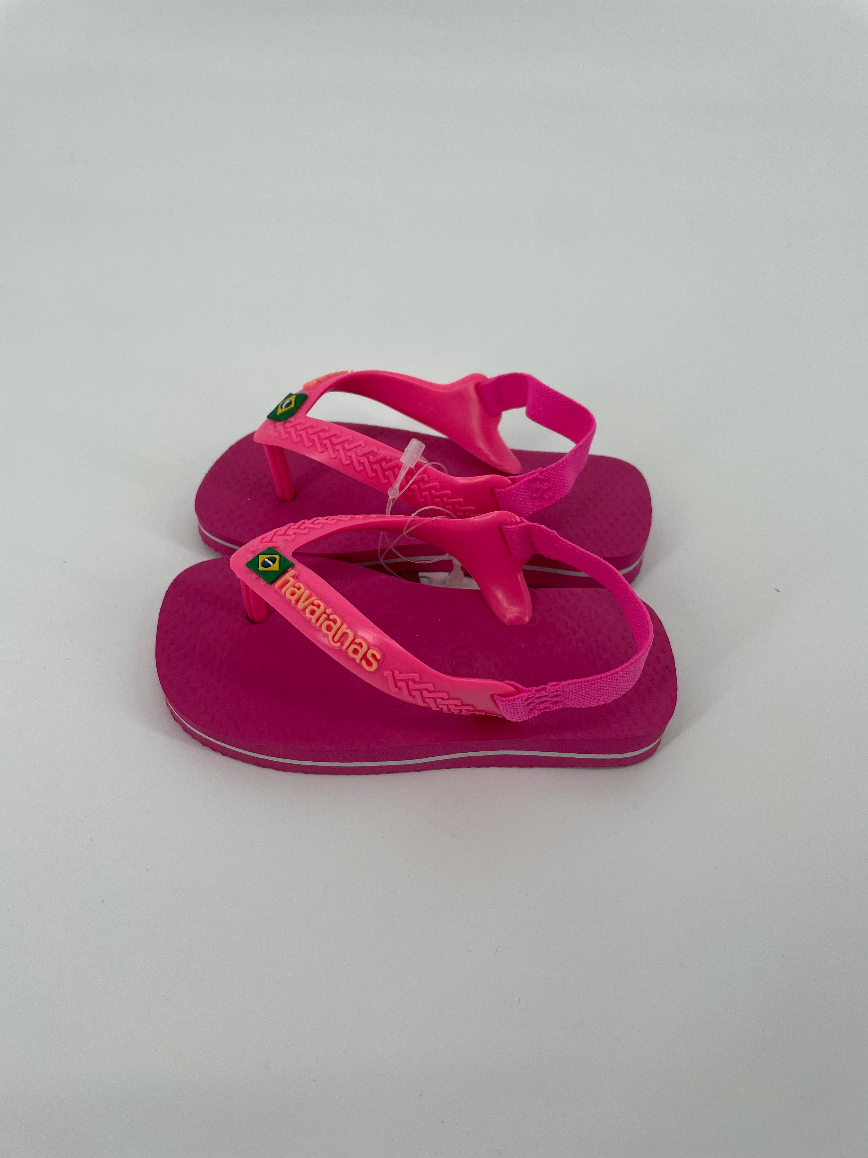 Roze baby slippers van Havaianas in maat 21. Met elastisch hielbandje en de kenmerkende Braziliaanse vlag en gele logo tekst op de bandjes.