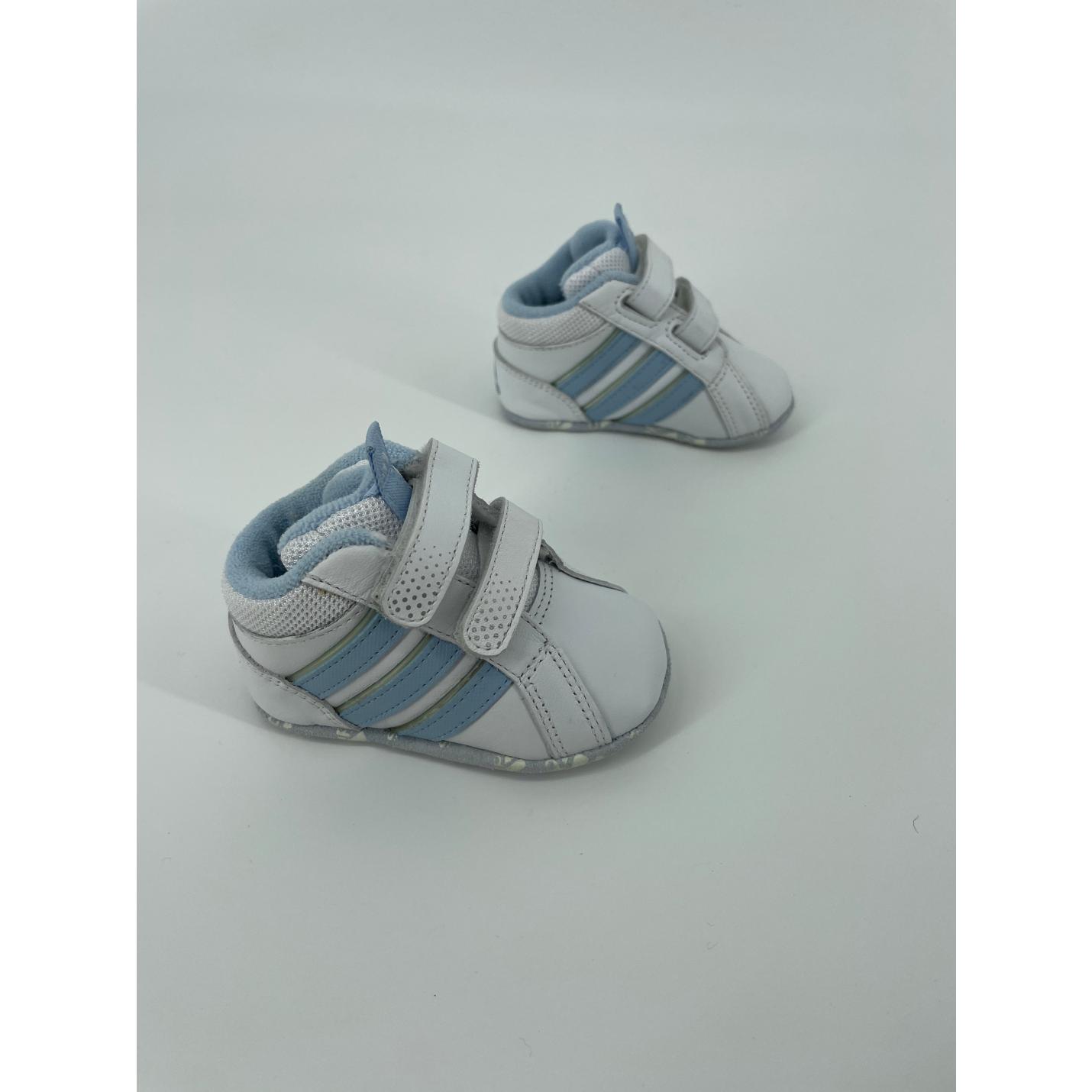 Wit met lichtblauwe babyschoentjes van Adidas in maat 17. Klittenband sluiting en zachte zool met antislip.