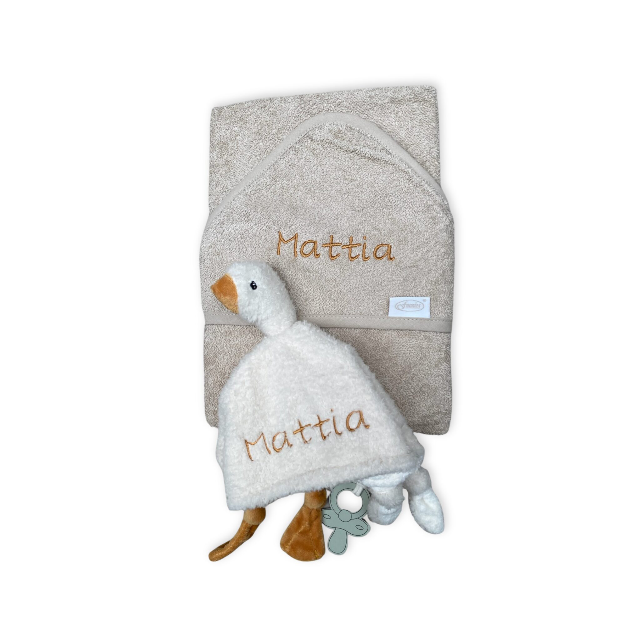 Op de voorbeeldfoto hebben we de naam van het kindje in lichtbruine letters op de badcape en het knuffeldoekje geborduurd.