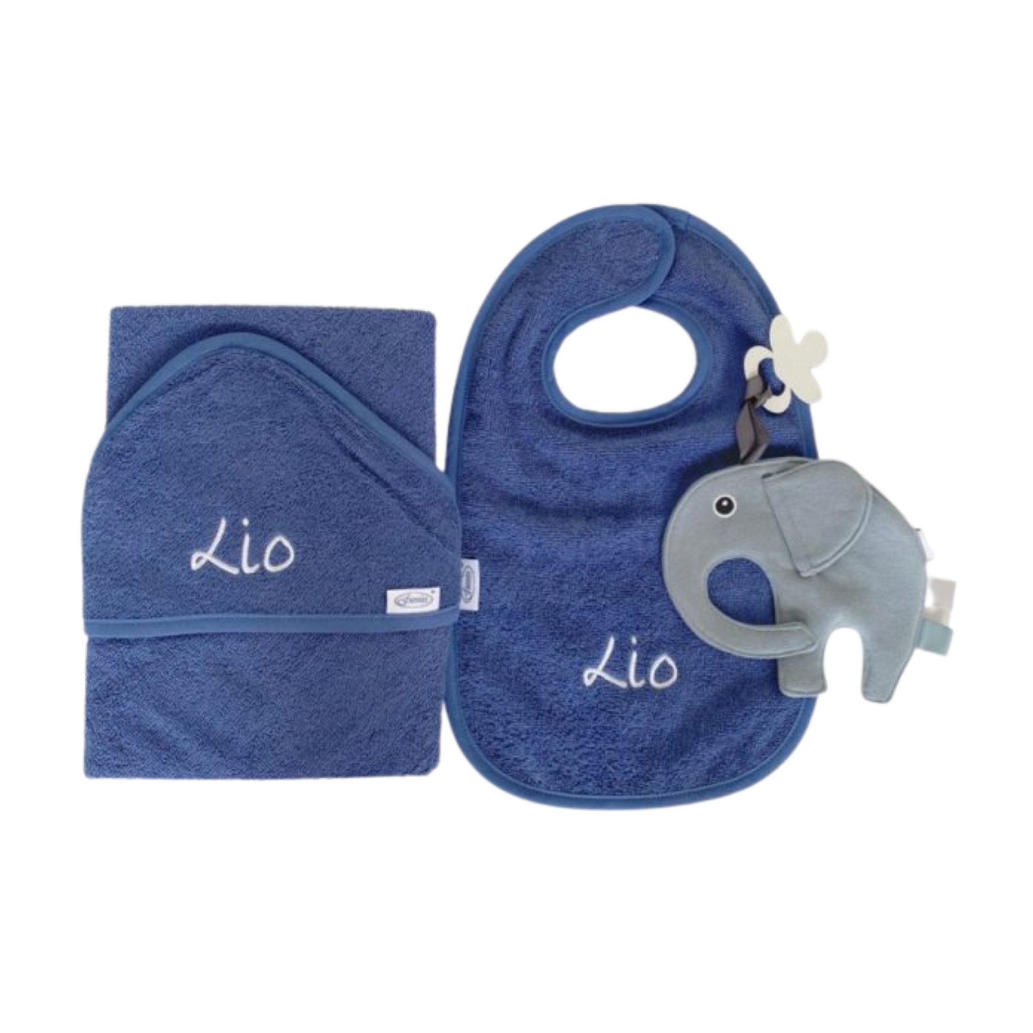 Deze kraamcadeau set bestaat uit een zachte badcape en slabbetje in de kleur Silkblue. De naam van het kindje borduren we in witte letters, deze zijn mooi zichtbaar op de badcape en het slabbetje. Het lettertype op de foto is eigenwijs.