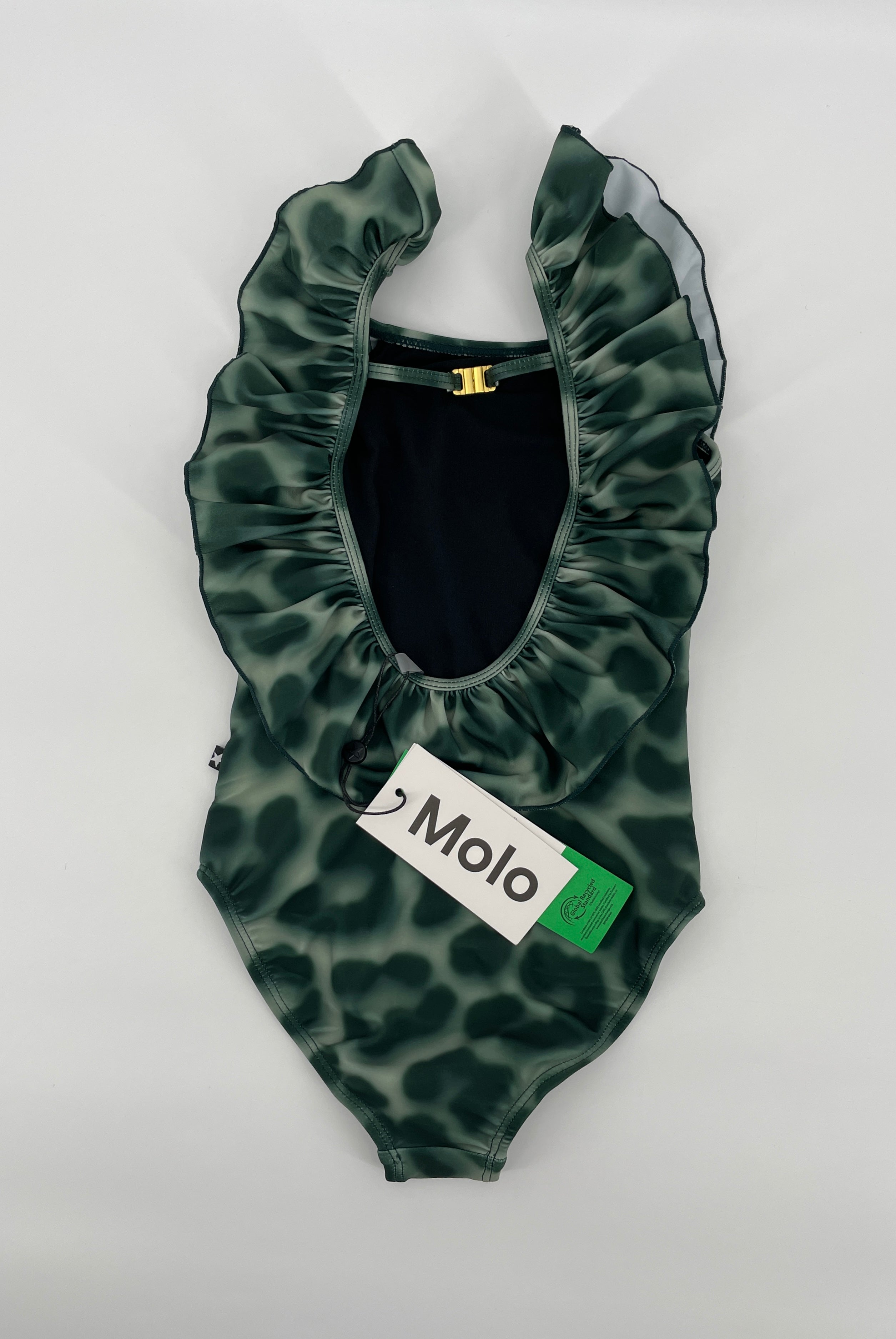 Groen badpak met jaguar print van Molo in maat 116. Gemaakt van elastisch, sneldrogend materiaal, met roesjes langs de schouders, UV 50+ zon bescherming en een open rug met bandje, zie foto’s.