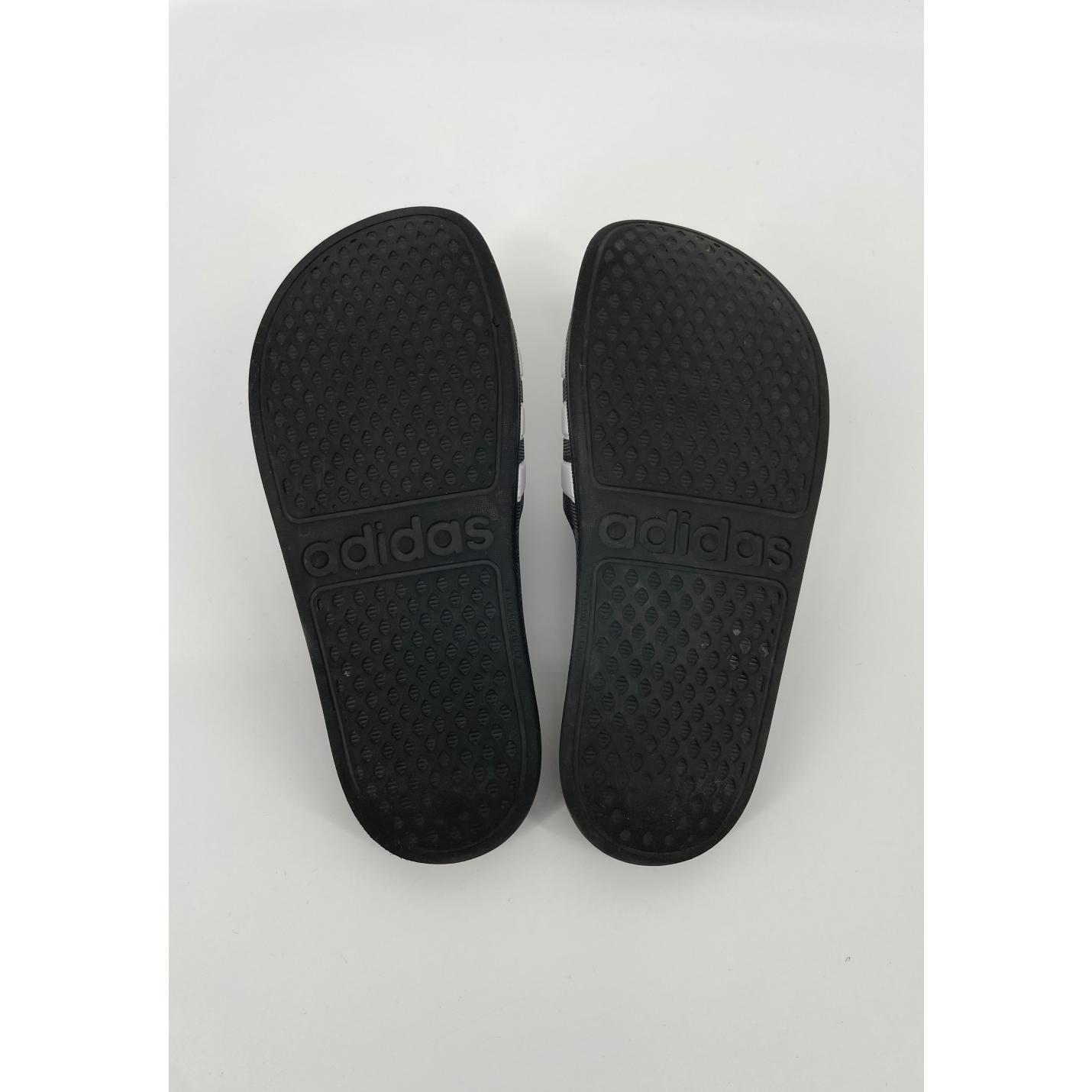 Zwarte badslippers van Adidas in maat 35. Model Adilette Aqua met voorgevormde brede band, witte strepen, voetbed en ‘adidas’ op de zijkanten.