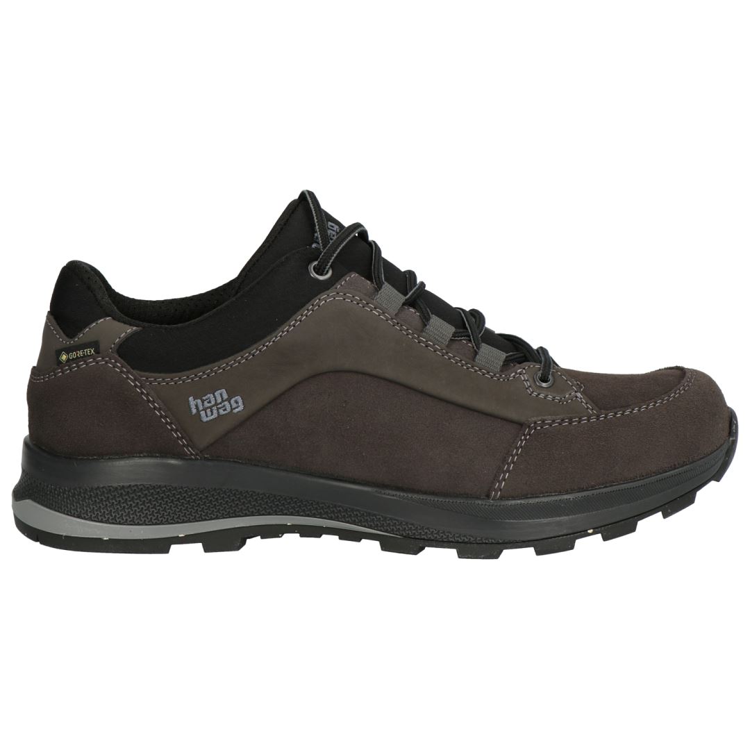 Een laag gesneden wandelschoen met hoogwaardige materialen ontworpen voor maximaal comfort. De Banks Low GTX is gemaakt van het fijnste nubuck- en suèdeleer nmet een Gore-Tex lining. Hij is bovendien uitgerust met een bijzonder comfortabele zool. Door de combinatie van een wig van versterkt PU-schuim met een hoogwaardig voetbed en extra, zachte hielversterking biedt de Banks Low GTX een bijzonder goede demping en zachte afrol. Hanwag heeft een speciale tongconstructie geïntegreerd - de Futura-tong - voor een gemakkelijke instap en een optimale omsluiting van de voet. Zo is de Banks Low GTX ideaal voor lange wandelingen door bossen en wouden of lagere bergketens.