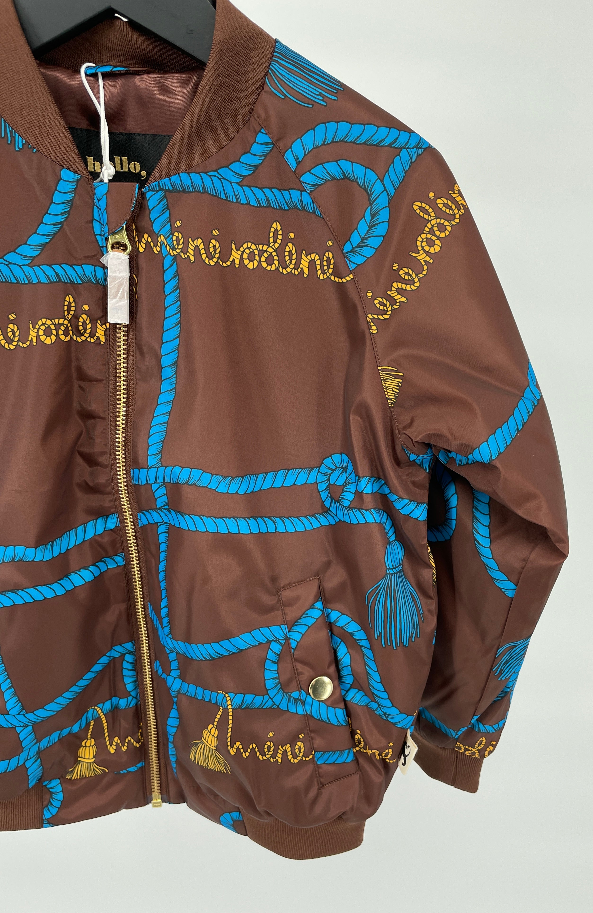 Bruine baseball jas van Mini Rodini met all over print van blauwe touwen en gele accenten, zie foto’s. Hij sluit met een rits, heeft voorop twee zakken met drukker sluiting en is gevoerd.