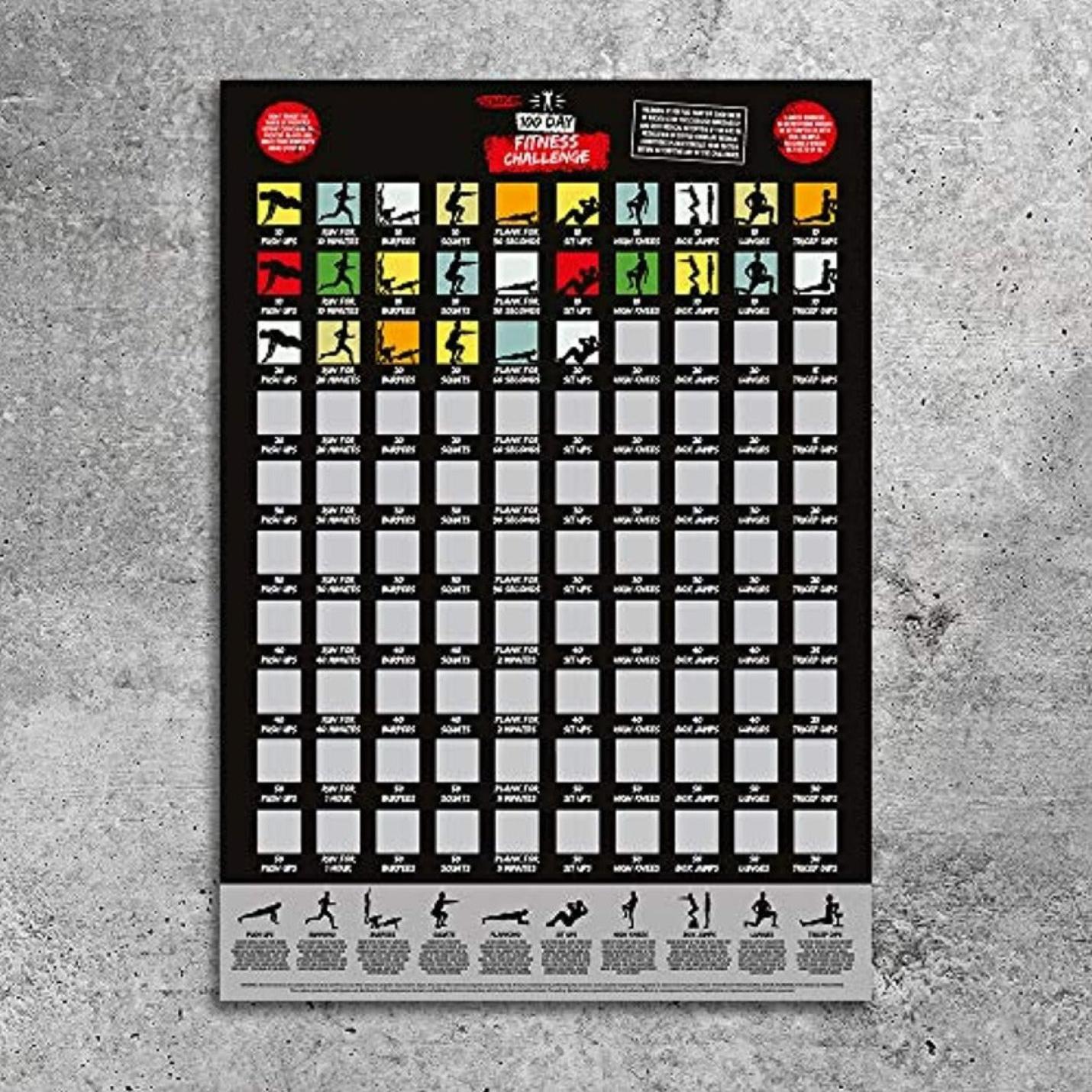 De 100 Dagen Fitness Challenge Krasposter is een poster met 100 vakjes, die elk een andere fitnessactiviteit bevat. Je krast elke dag een vakje af na het uitvoeren van de activiteit, waardoor je gemotiveerd blijft om je doelen te bereiken.