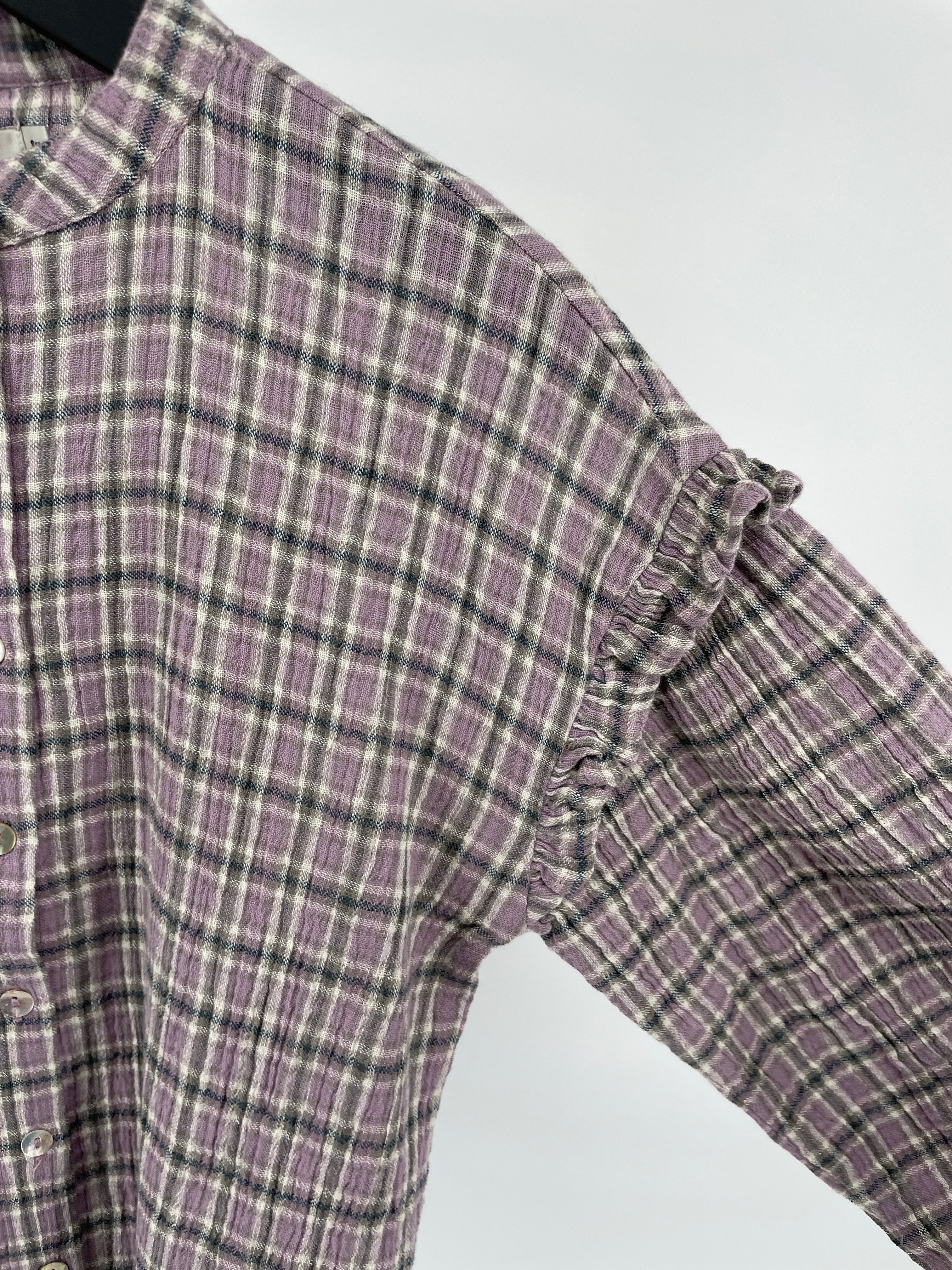 Paars geblokte blouse van The New Society in maat 128. Het is een recht model met een lavendel paars ruitje, ronde hals, roesjes op de schoudernaad en parelmoer knoopjes voor, zie foto's.