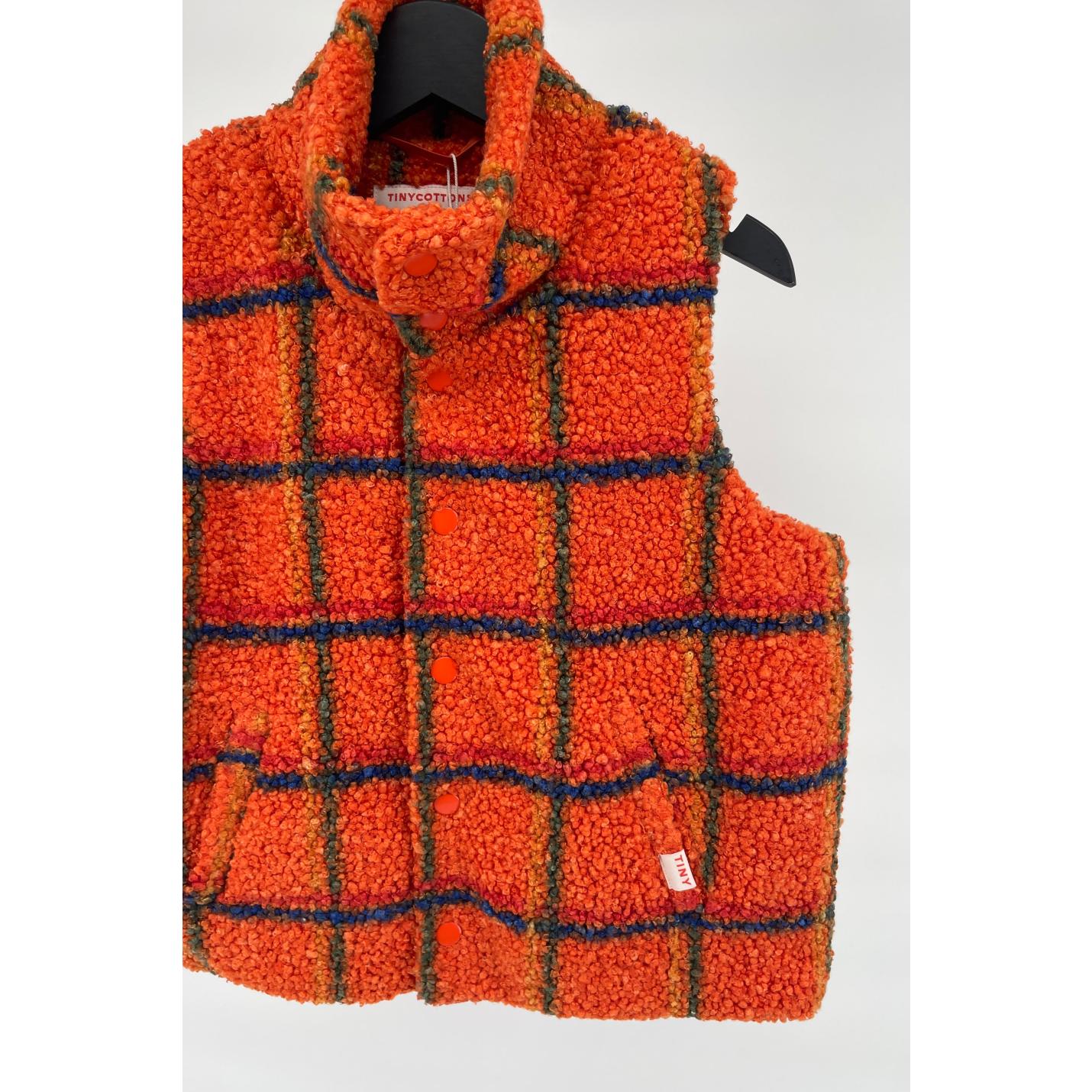 Oranje bodywarmer met blauw groen gele ruit van Tiny Cottons in maat 128. Hij sluit voor met drukkers, heeft een hoge nek en twee zakken voorop. De binnenkant is licht gevoerd en afgewerkt met effen oranje stof, zie foto’s.