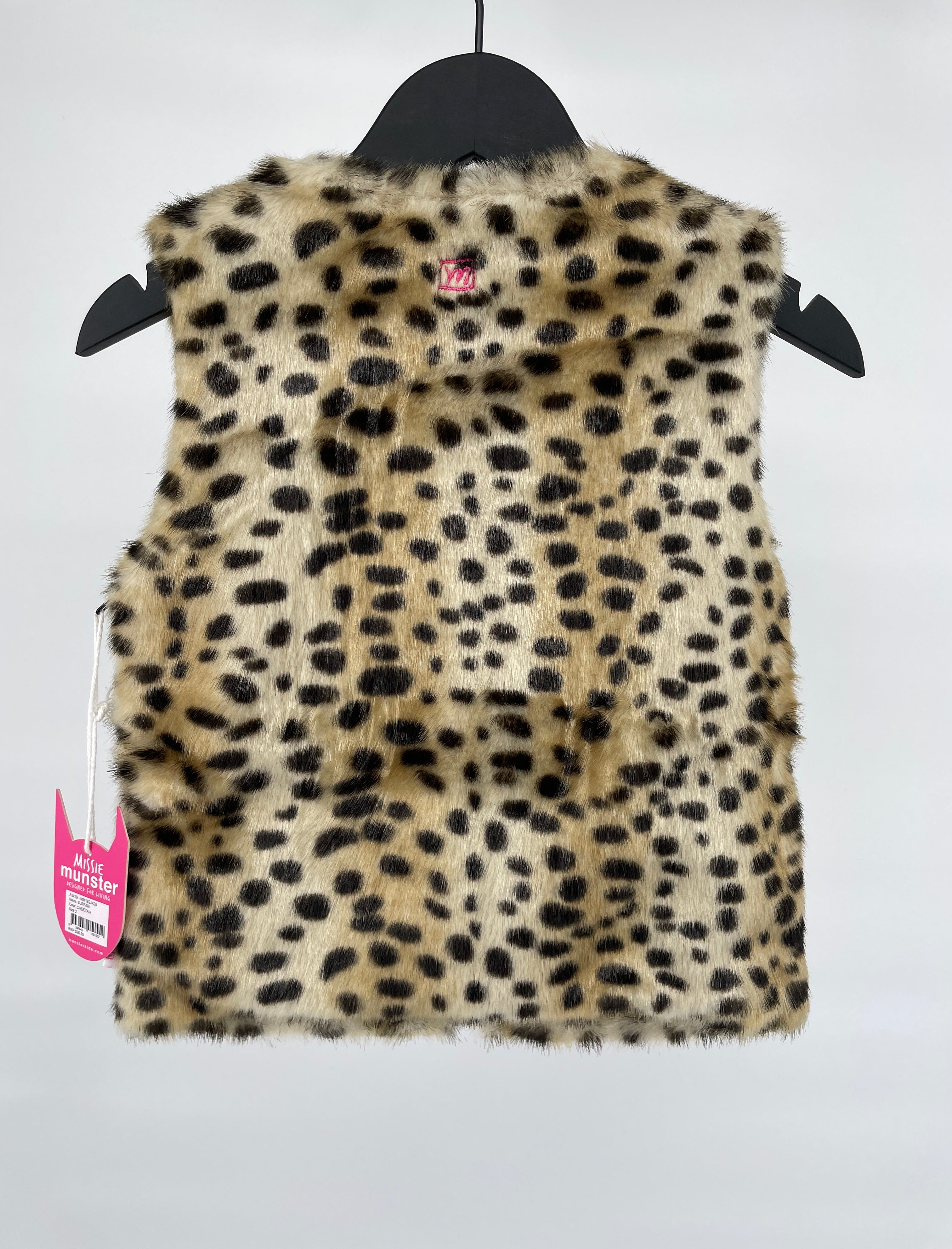 Beige bodywarmer met cheetah print van Munster Kids. Hij sluit met een rits, heeft een ronde halslijn en is vanbinnen netjes afgewerkt met beige voering, zie foto’s. Aan beide zijkanten zitten twee steekzakken.