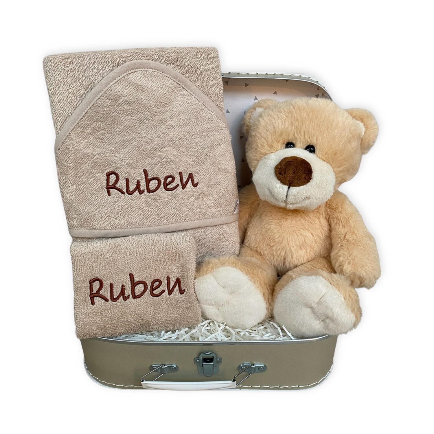 In dit koffertje stoppen we een zachte badcape en slabbetje welke we met de naam van het kindje borduren, en super zachte knuffel beer Boris.