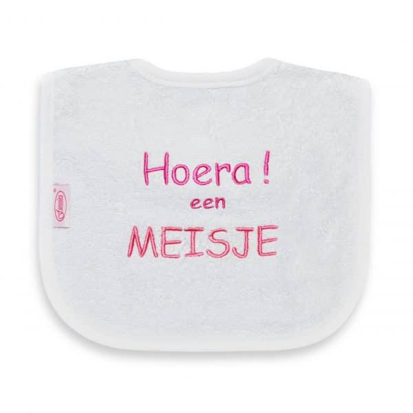 Dit mandje is gevuld met een slabbetje met de tekst ‘Hoera! Een meisje’ en een super zacht ooievaar knuffeltje (34 cm) van Happy Horse.