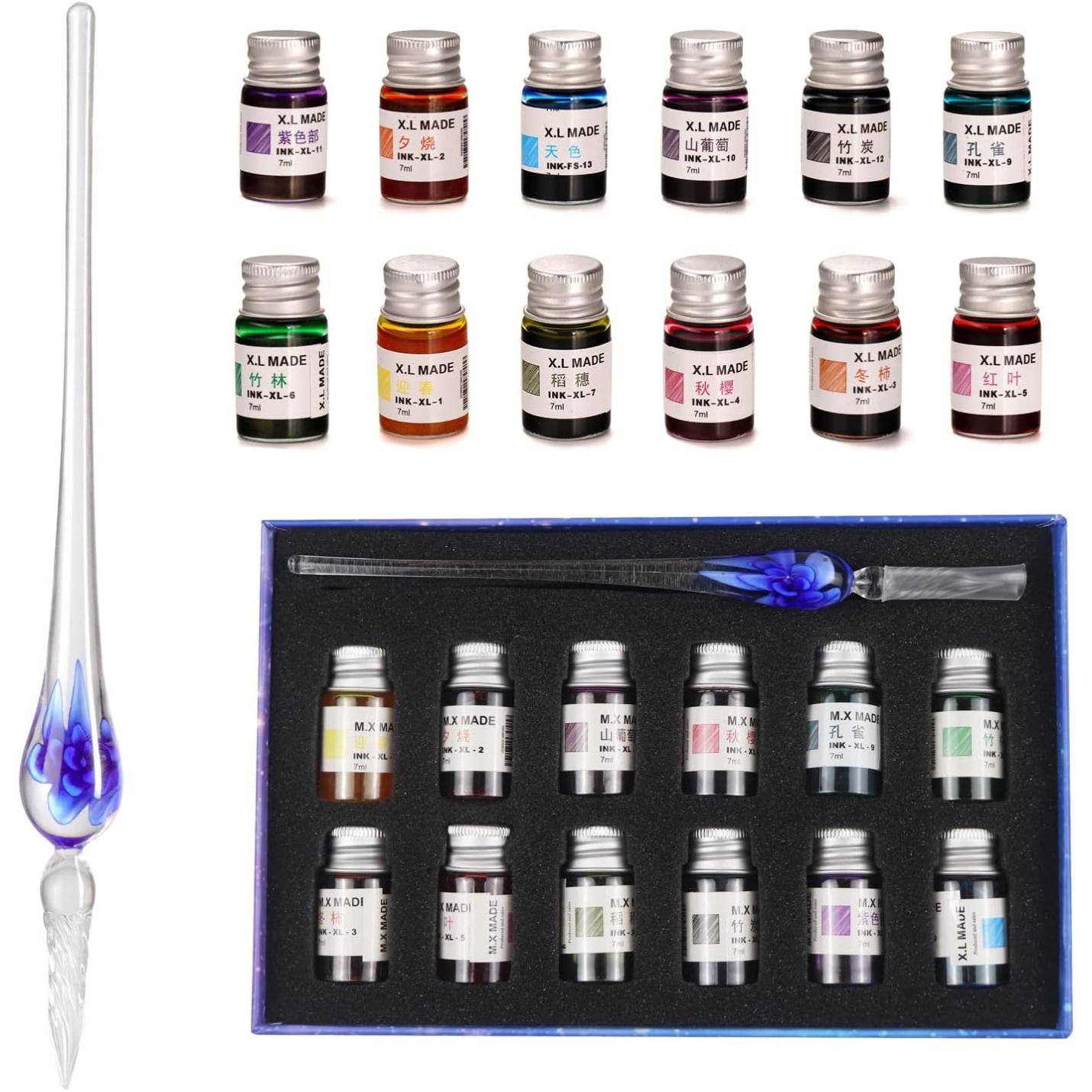 De set wordt geleverd met 12 flessen inkt in verschillende kleuren, zodat je de perfecte kleur kunt vinden voor elk project. De glazen pen is ook een prachtig cadeau voor elke gelegenheid.