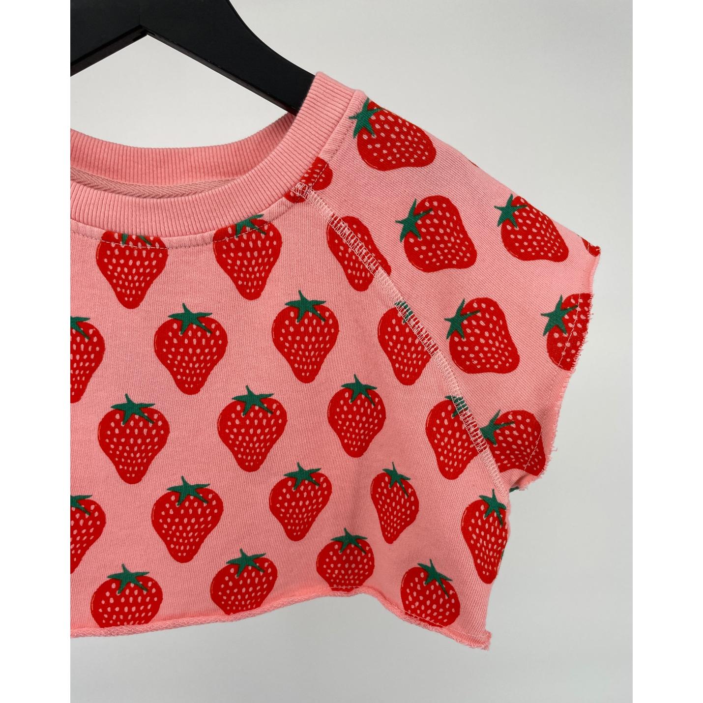 Roze crop top van Bobo chose in dunne joggingstof. Hij heeft een all over print van rode aardbeien en nonchalant afgewerkte mouwen en onderkant met rafeltjes, zie foto’s. Valt kort en breed.