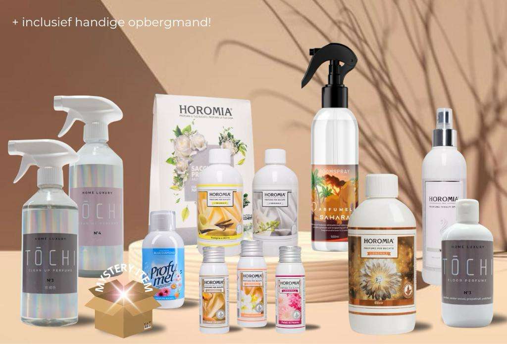 Deze box bestaat uit 14 full-size producten (inclusief 1 mystery-item) van wasparfum, huisgeuren en schoonmaakmiddelen met een totale waarde van €249,95, en kost nu maar €99,95! Dat betekent dat je 10 producten helemaal gratis krijgt!! De box wordt ook nog eens geleverd in een handige opbergmand, zodat je al jouw world of scents producten makkelijk kan opbergen.
