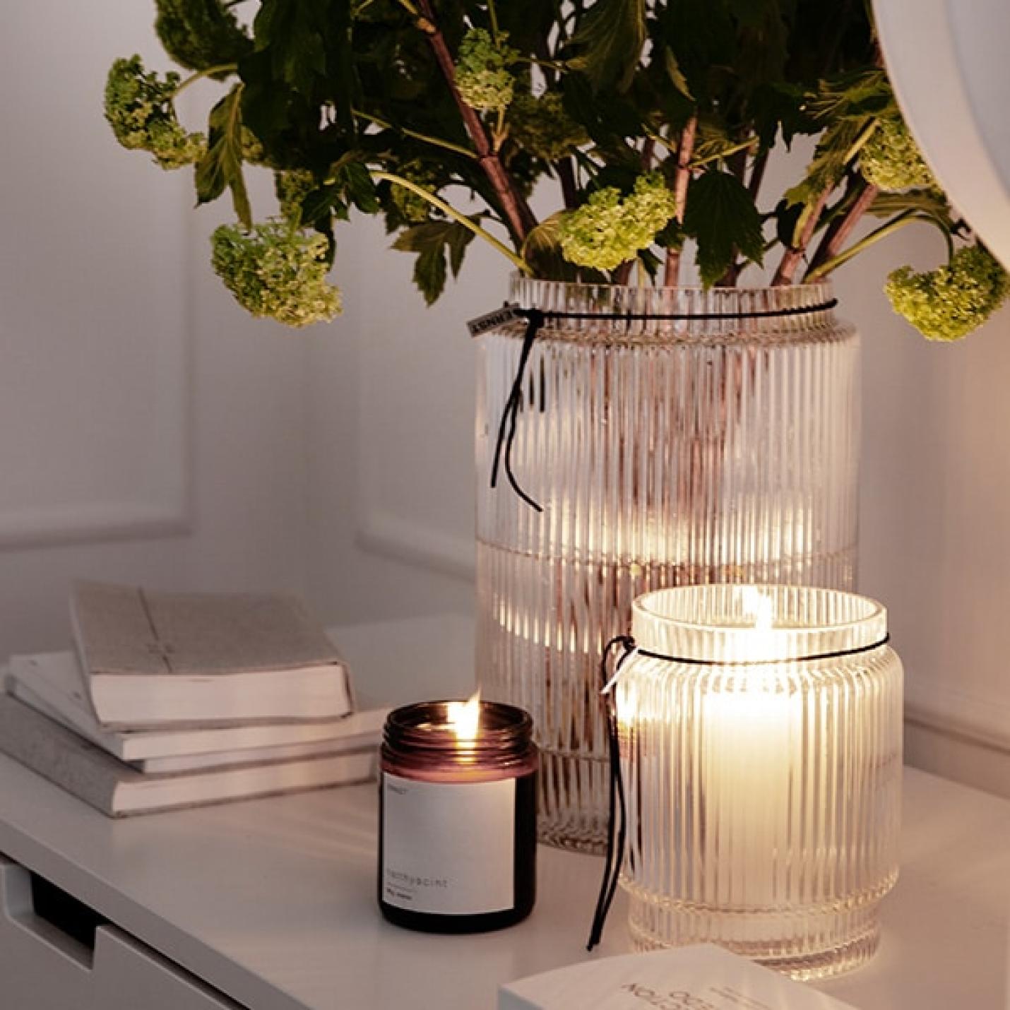 De ERNST vaas / waxinelicht glas ribbel 12 is prachtig door zijn robuuste ronde vorm. Gemaakt van dik helder glas en voorzien van een leren koortje.