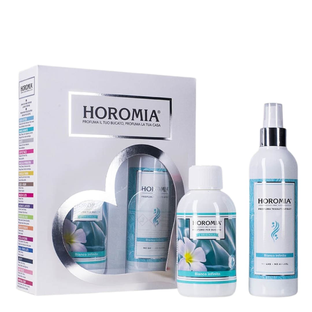 Geef een mooi cadeau met de Horomia giftset, bestaande uit een wasparfum van 250 ml en een textielspray van 250 ml. Geleverd in een luxe kadoverpakking. Bianco Infinito is een heerlijke combinatie van vanille, magnolia en witte musk.