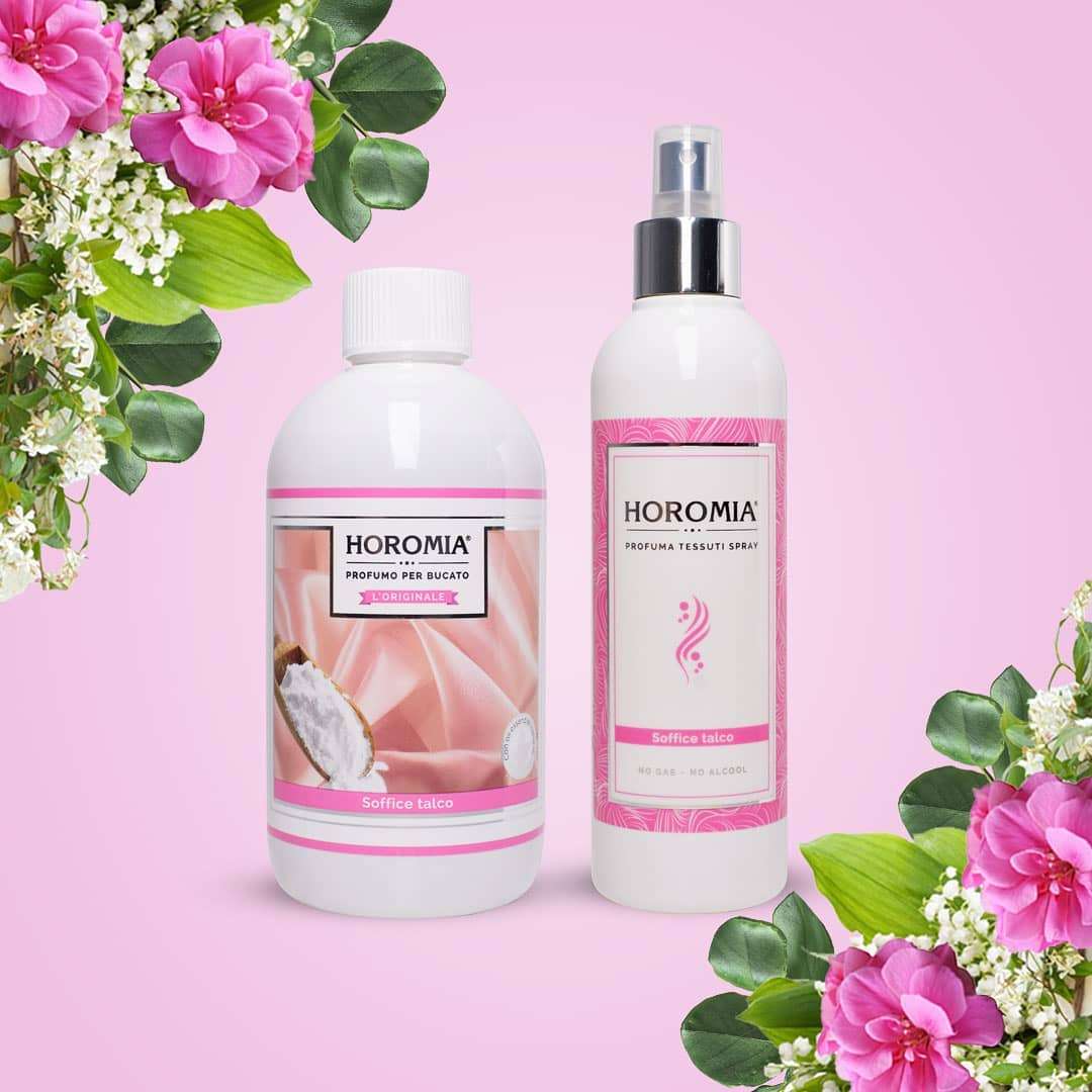 Horomia wasparfum en textielsprays voegen een geurexplosie toe aan al je wasgoed en textiel. Soffice Talco is een betoverende geurmix van lelietje van dalen, geranium, jasmijn en witte musk.