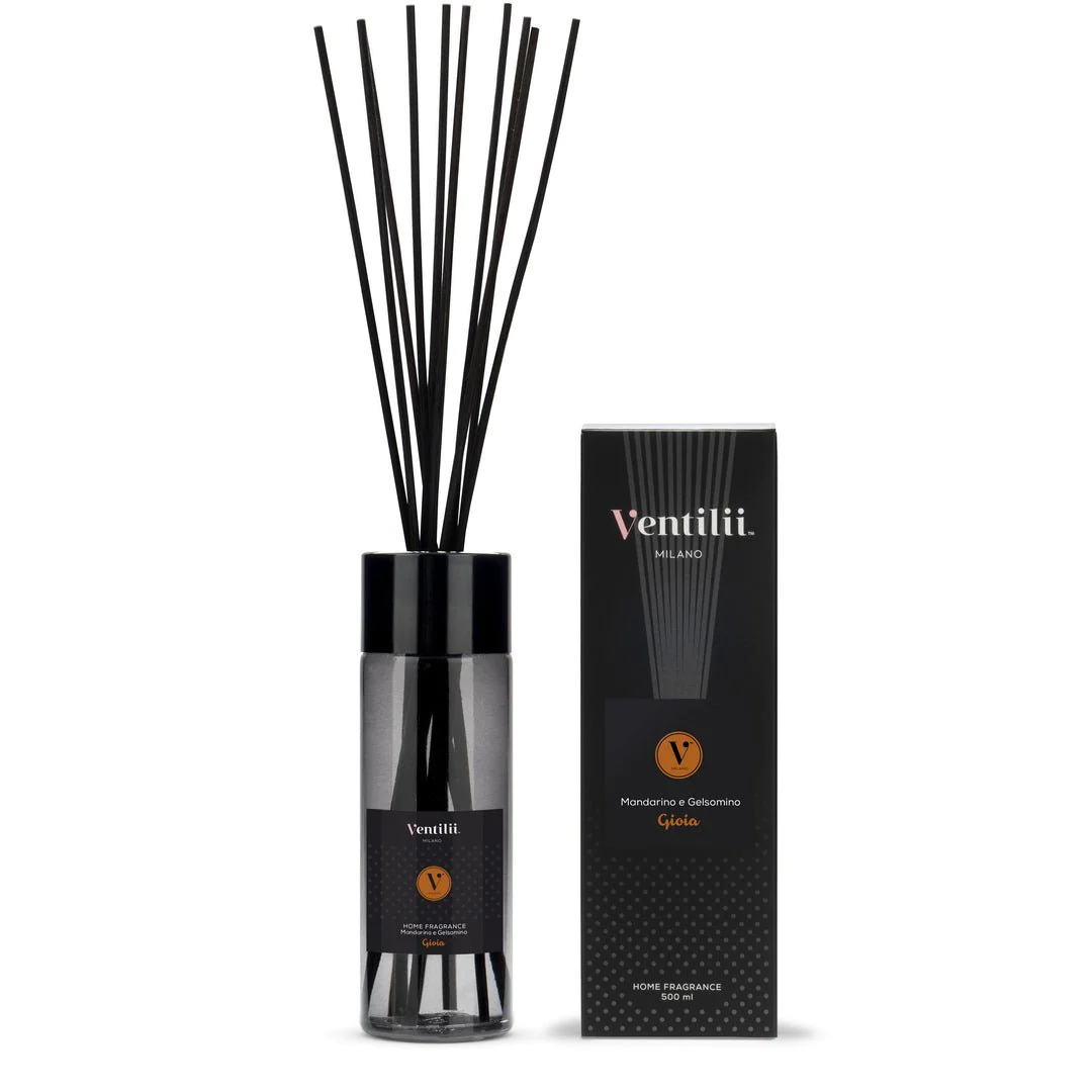 Geurstokjes van het Italiaanse merk Ventilii Milano, met een stijlvolle uitstraling en de heerlijke geur GIOIA met een combinatie van sinaasappelschil, citroen en mandarijn. Prikkelt de zintuigen met koningsbasilicum tussen de bloemen, jasmijn en neroli en met verse kruiden en dennenhout.