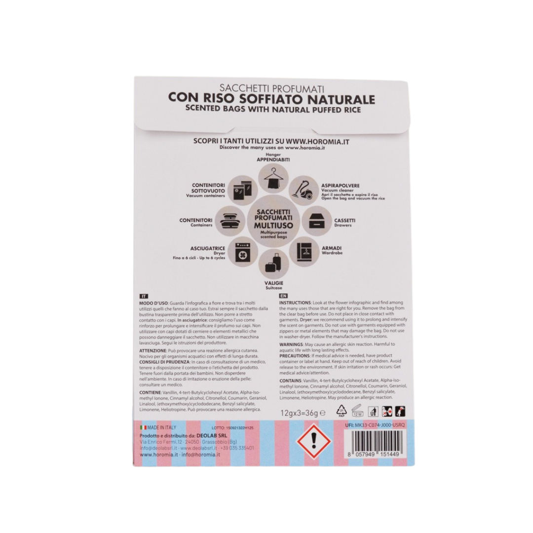 De geurzakjes zijn gevuld met natuurlijke non-food gepofte rijst. De geparfumeerde zakjes van Horomia zijn gemaakt om je kleding en je huis de unieke en onmiskenbare geur van je favoriete parfum te geven. Elke verpakking bevat drie geurzakjes. Geniet tot wel 12 weken van een intense en langdurige geur.