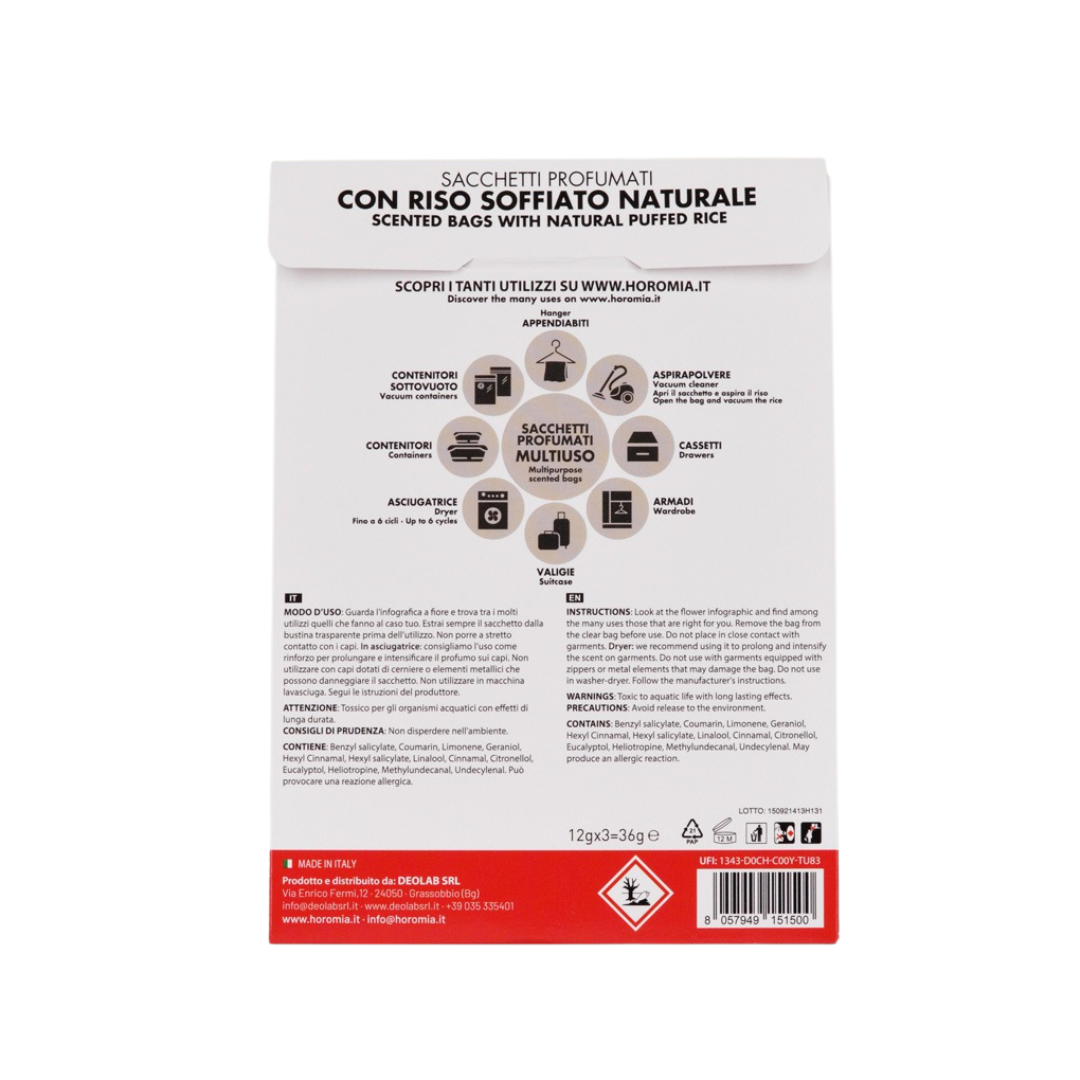 De geurzakjes zijn gevuld met natuurlijke non-food gepofte rijst. De geparfumeerde zakjes van Horomia zijn gemaakt om je kleding en je huis de unieke en onmiskenbare geur van je favoriete parfum te geven. Elke verpakking bevat drie geurzakjes. Geniet tot wel 12 weken van een intense en langdurige geur.