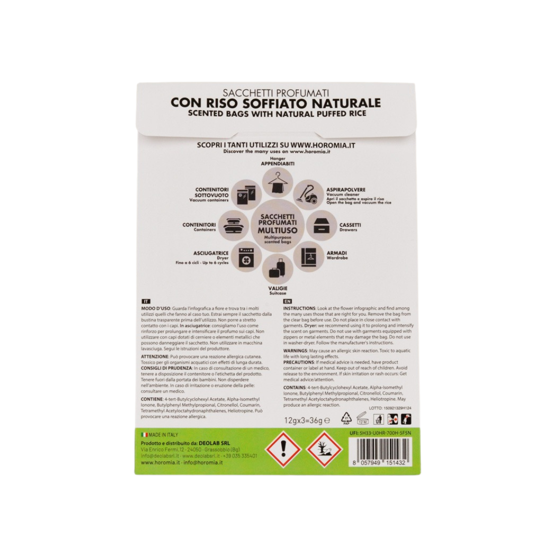 De geurzakjes zijn gevuld met natuurlijke non-food gepofte rijst. De geparfumeerde zakjes van Horomia zijn gemaakt om je kleding en je huis de unieke en onmiskenbare geur van je favoriete parfum te geven. Elke verpakking bevat drie geurzakjes. Geniet tot wel 12 weken van een intense en langdurige geur.
