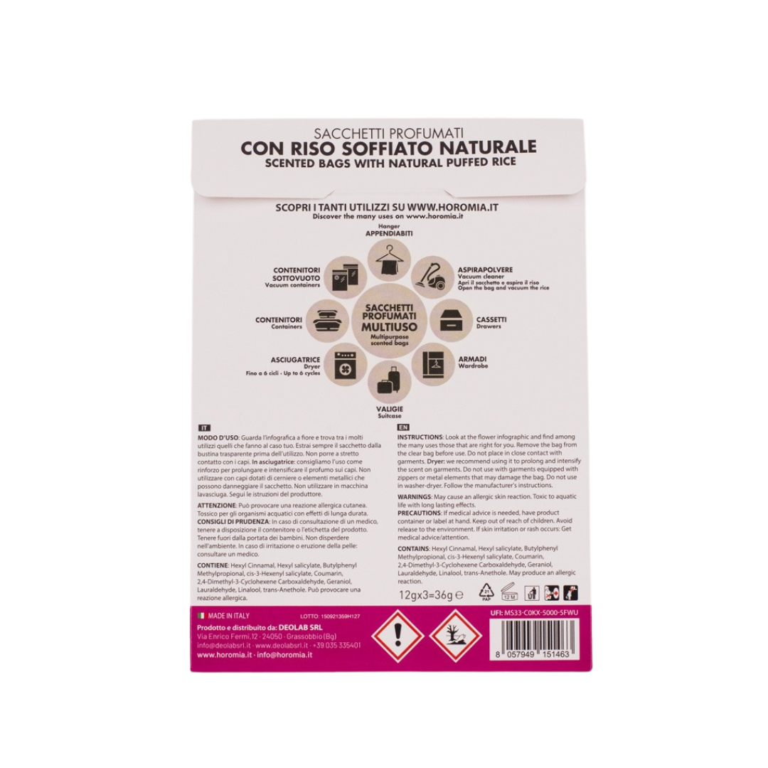De geurzakjes zijn gevuld met natuurlijke non-food gepofte rijst. De geparfumeerde zakjes van Horomia zijn gemaakt om je kleding en je huis de unieke en onmiskenbare geur van je favoriete parfum te geven. Elke verpakking bevat drie geurzakjes. Geniet tot wel 12 weken van een intense en langdurige geur.