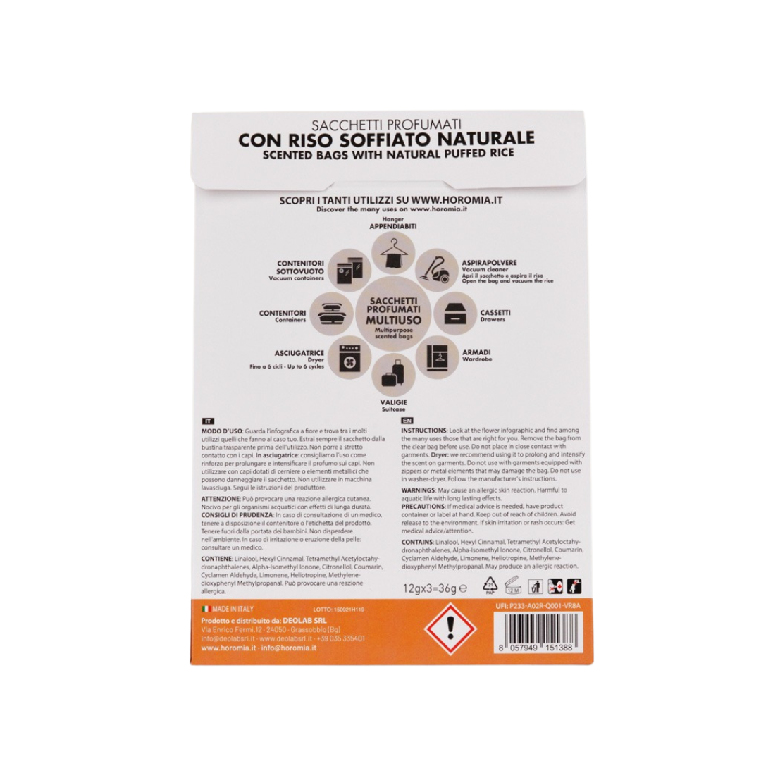 De geurzakjes zijn gevuld met natuurlijke non-food gepofte rijst. De geparfumeerde zakjes van Horomia zijn gemaakt om je kleding en je huis de unieke en onmiskenbare geur van je favoriete parfum te geven. Elke verpakking bevat drie geurzakjes. Geniet tot wel 12 weken van een intense en langdurige geur.