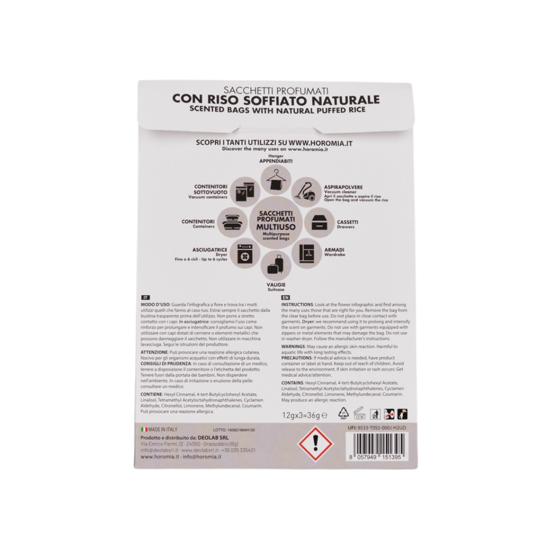De geurzakjes zijn gevuld met natuurlijke non-food gepofte rijst. De geparfumeerde zakjes van Horomia zijn gemaakt om je kleding en je huis de unieke en onmiskenbare geur van je favoriete parfum te geven. Elke verpakking bevat drie geurzakjes. Geniet tot wel 12 weken van een intense en langdurige geur.