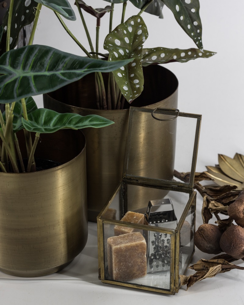 Dit mooie vierkante bewaardoosje van goudkleurig aluminium en glas is uitermate geschikt om er wat moois in te bewaren