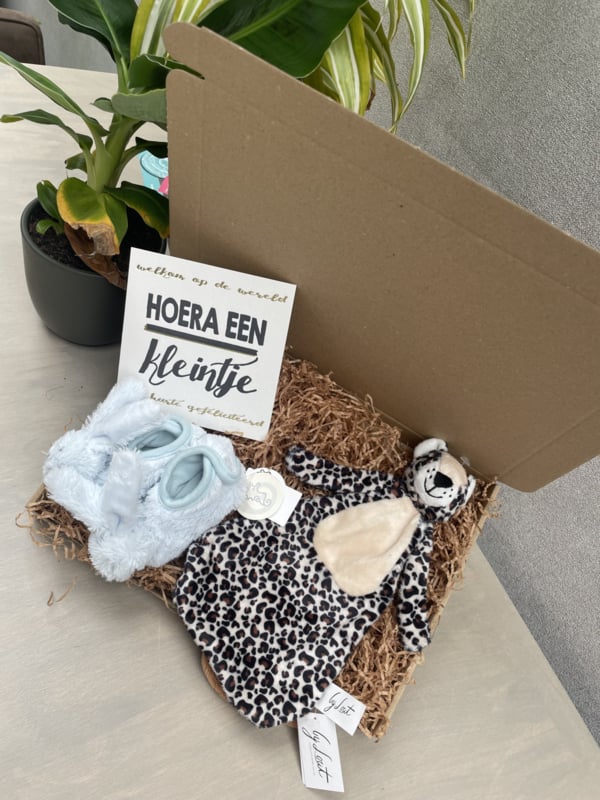 Super leuke brievenbus cadeauset met de happy horse Richie slofjes en By Lout Leopard Lou knuffeldoekje.