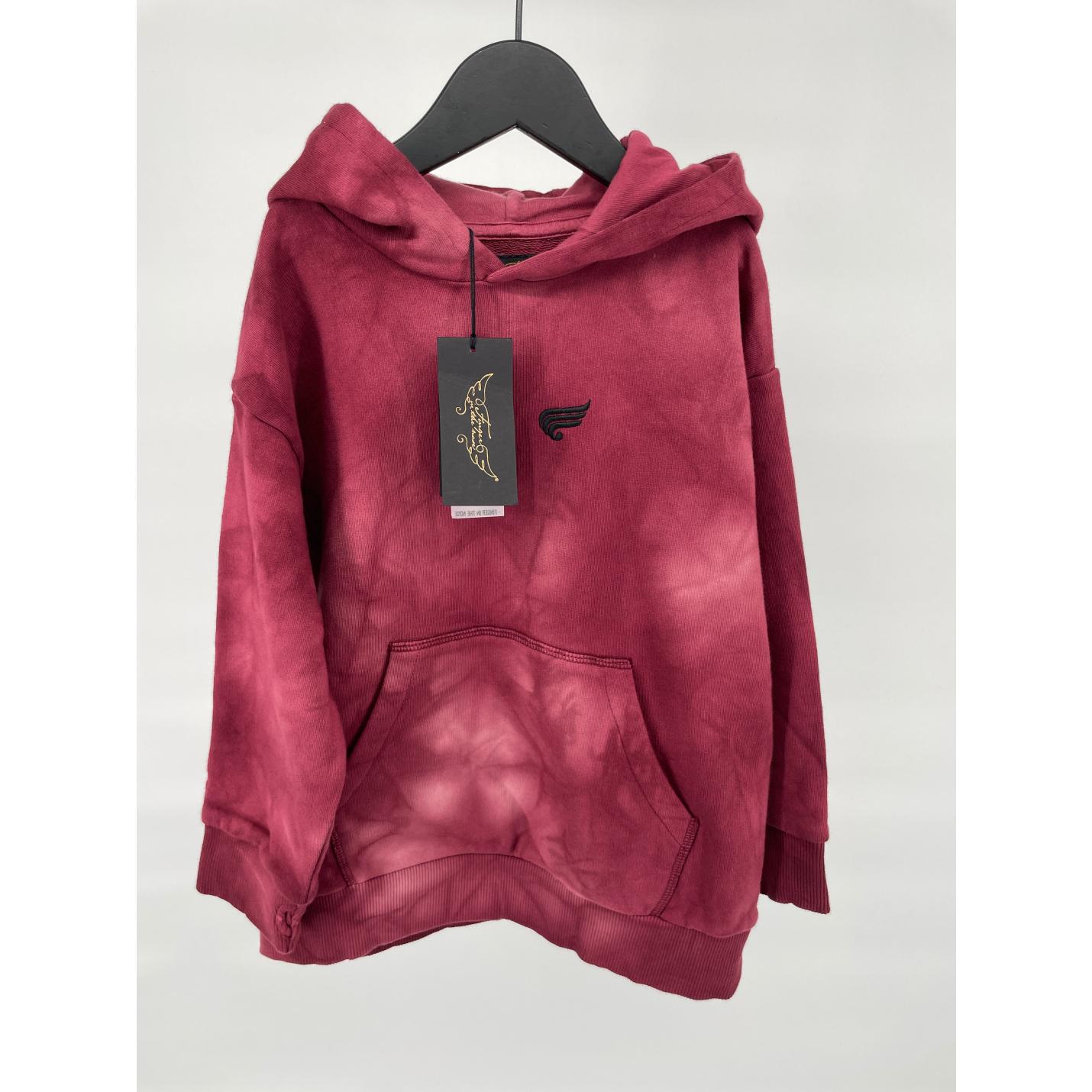 Rode tie dye hoodie van Finger in the Nose met geborduurd logo op de borst en kangoeroe zakken voorop. In de boorden zit een duimopening, zie foto’s.