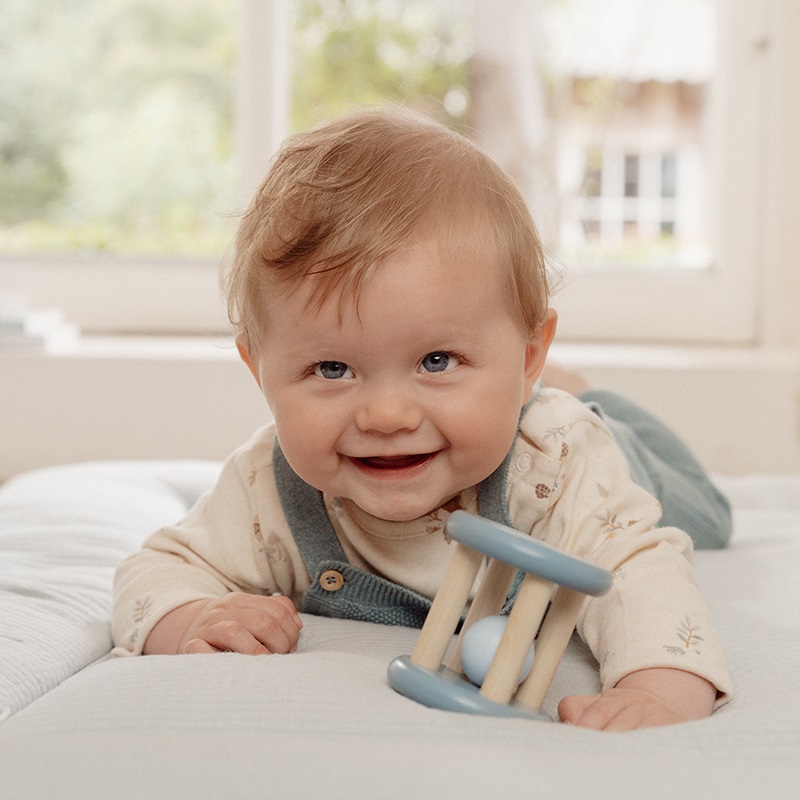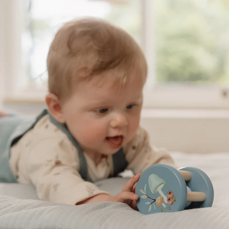 De mooie blauwe houten rammelaar van de Forest Friends lijn van Little Dutch zorgt voor uren speelplezier!