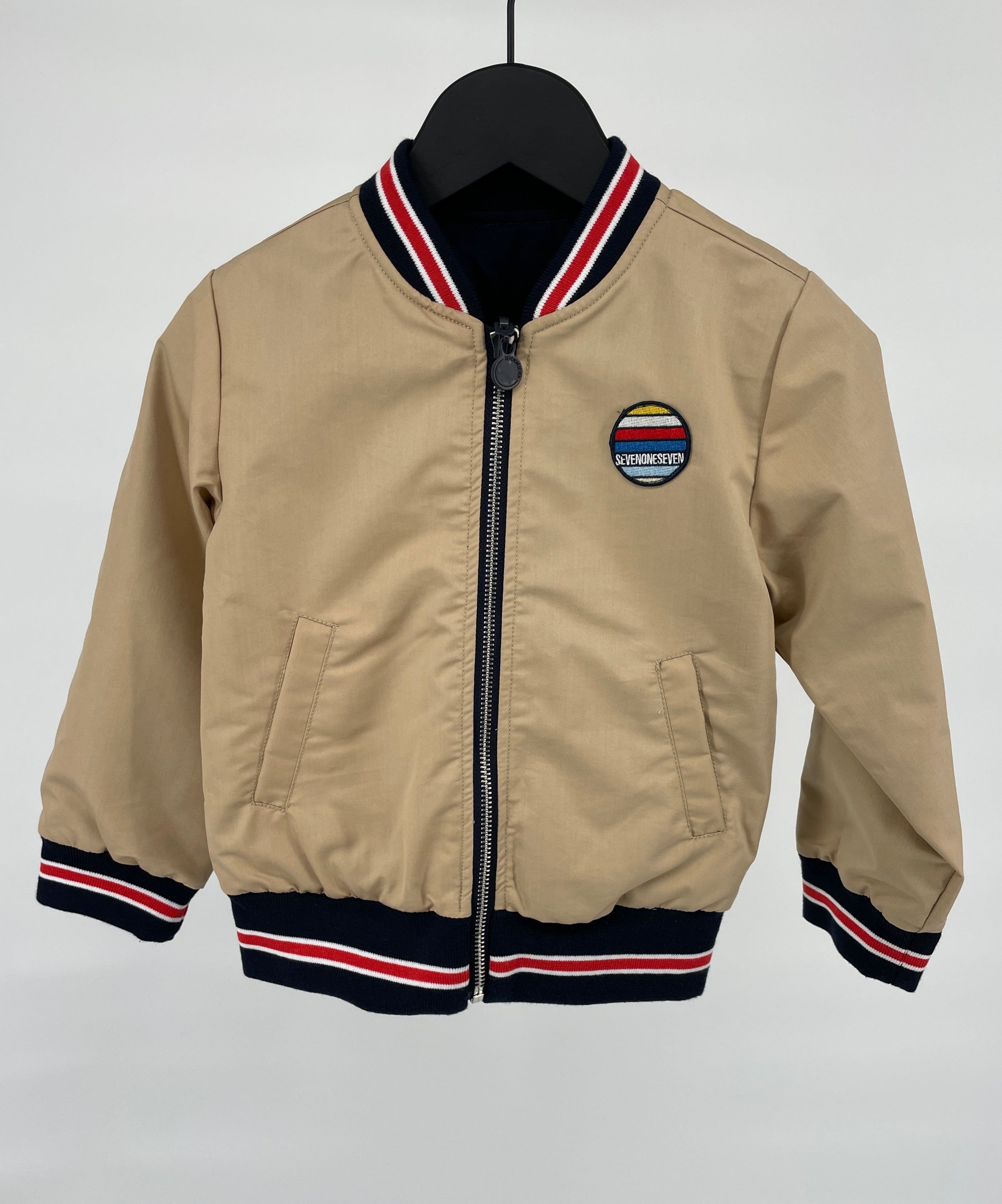 Mooi jasje dat je aan twee kanten kunt dragen van Seven One Seven in maat 98 / 104. Hij heeft een beige kant en een donkerblauwe kant. De beige kant heeft een geborduurde merkapplicatie…