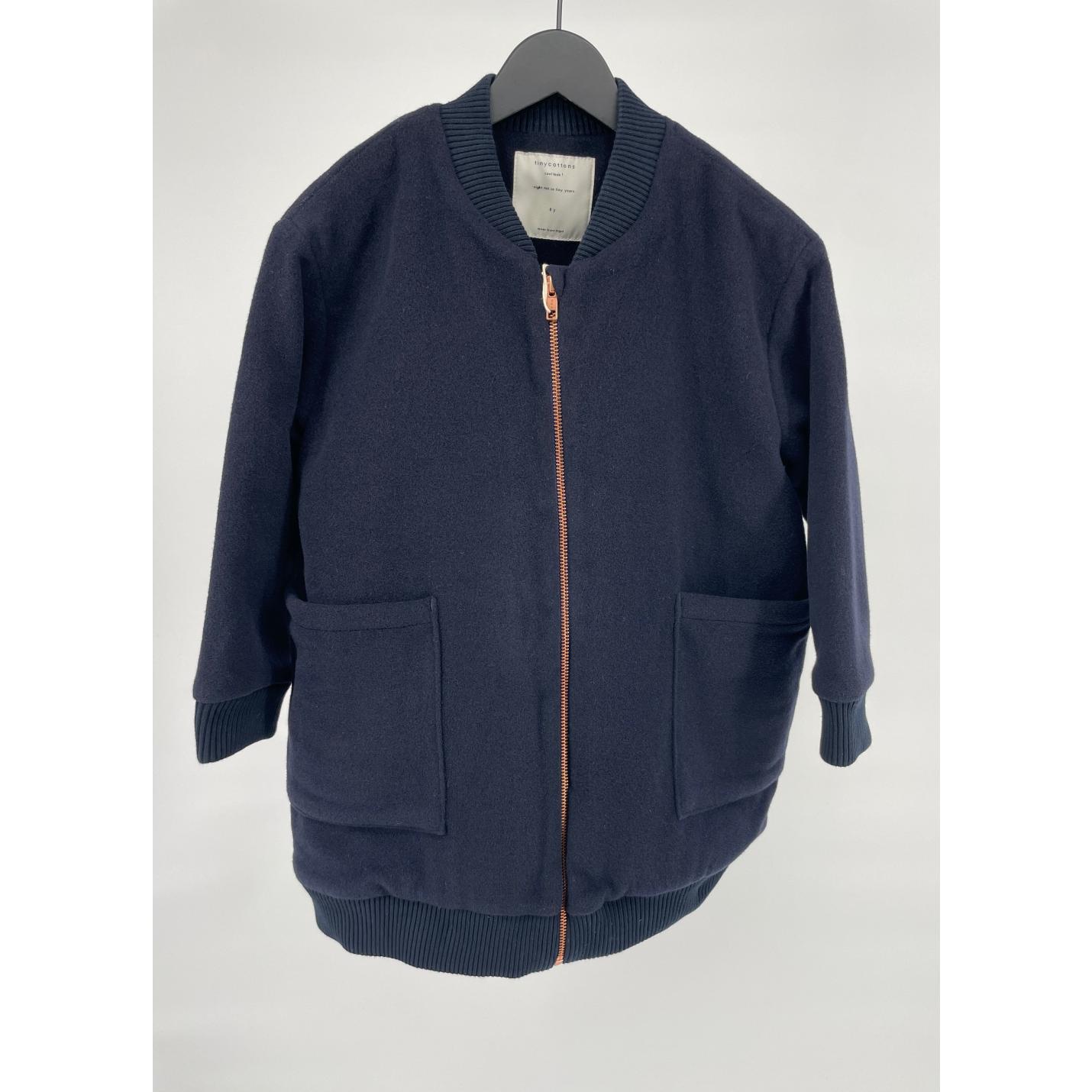 Donkerblauwe wollen jas van Tiny Cottons in maat 128. De jas sluit voor met een rits en heeft twee grote zakken. Het is een wat langer model. Op de bovenzijde van de rug staat in bruine…