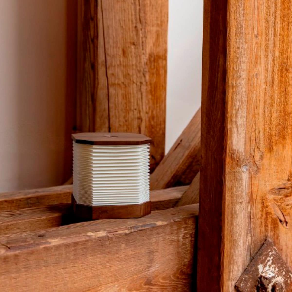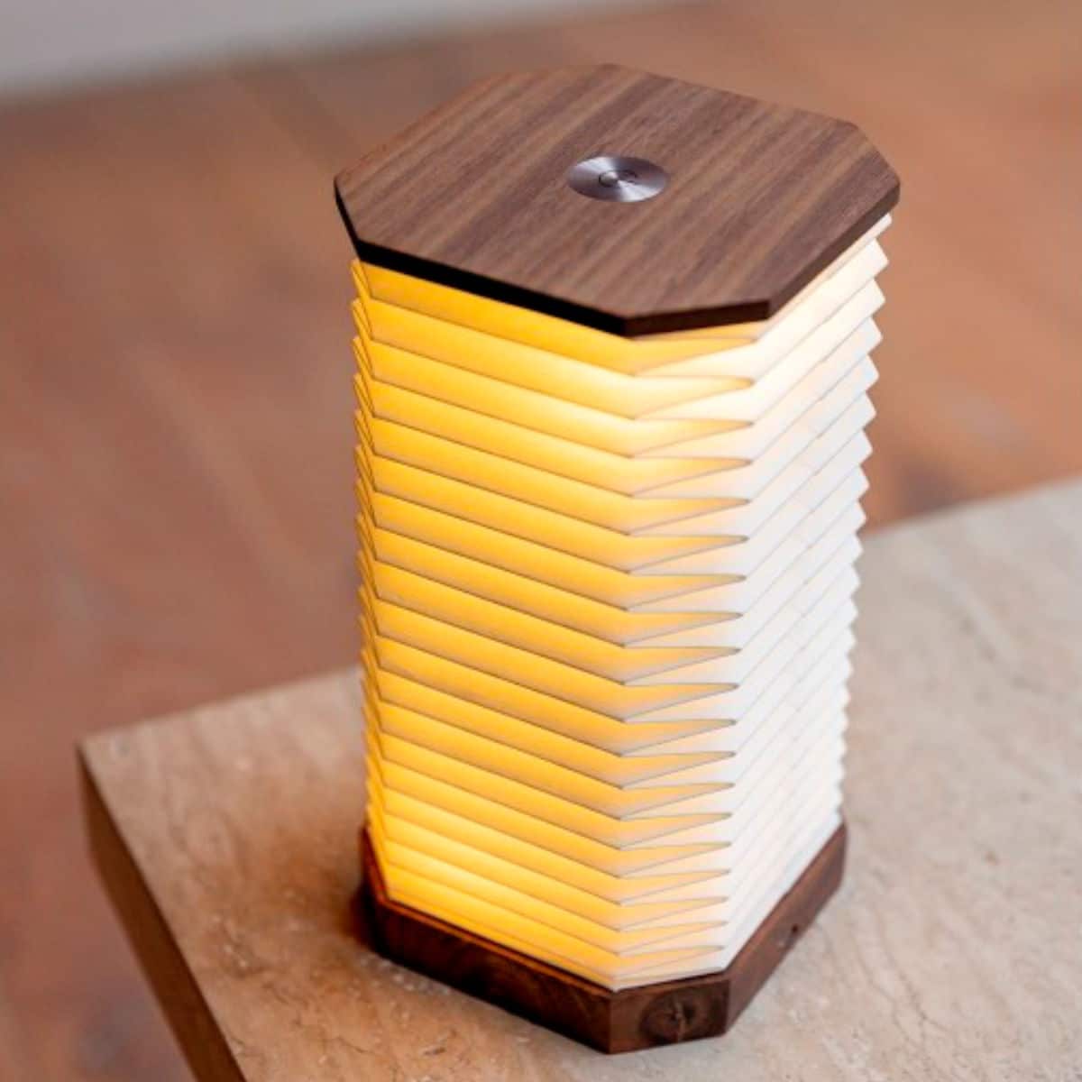 De Jens Living accordeon led lamp walnoot is oplaadbaar en gemaakt van papier en hout. Het gevouwen design in combinatie met het walnoothout zorgt voor een warme sfeer.