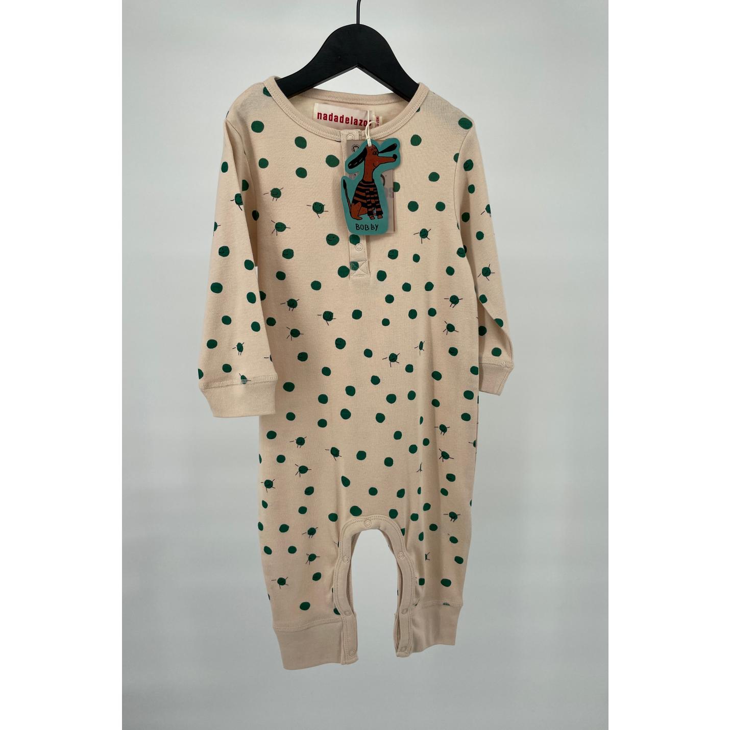 Beige jumpsuit met erwtjes print van Nadadelazos in maat 86 / 92. Hij heeft lange mouwen, drukkers aan de voorzijde en rondom de benen voor makkelijk aan- en uitkleden en verschonen.
