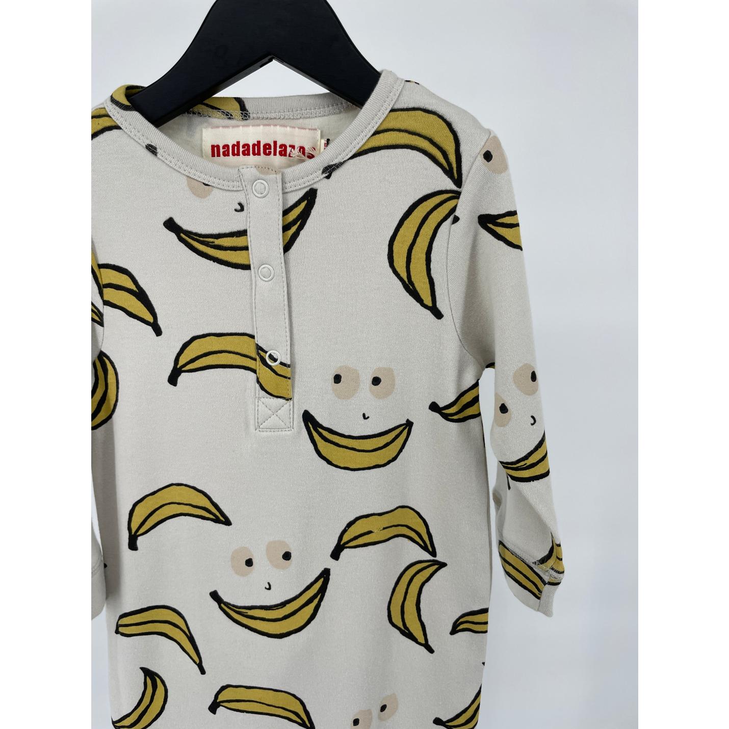 Lichtgrijze jumpsuit met bananen en gezichtjes print van Nadadelazos in maat 74 / 80. Hij heeft lange mouwen, drukkers aan de voorzijde en rondom de benen voor makkelijk aan- en uitkleden en verschonen.