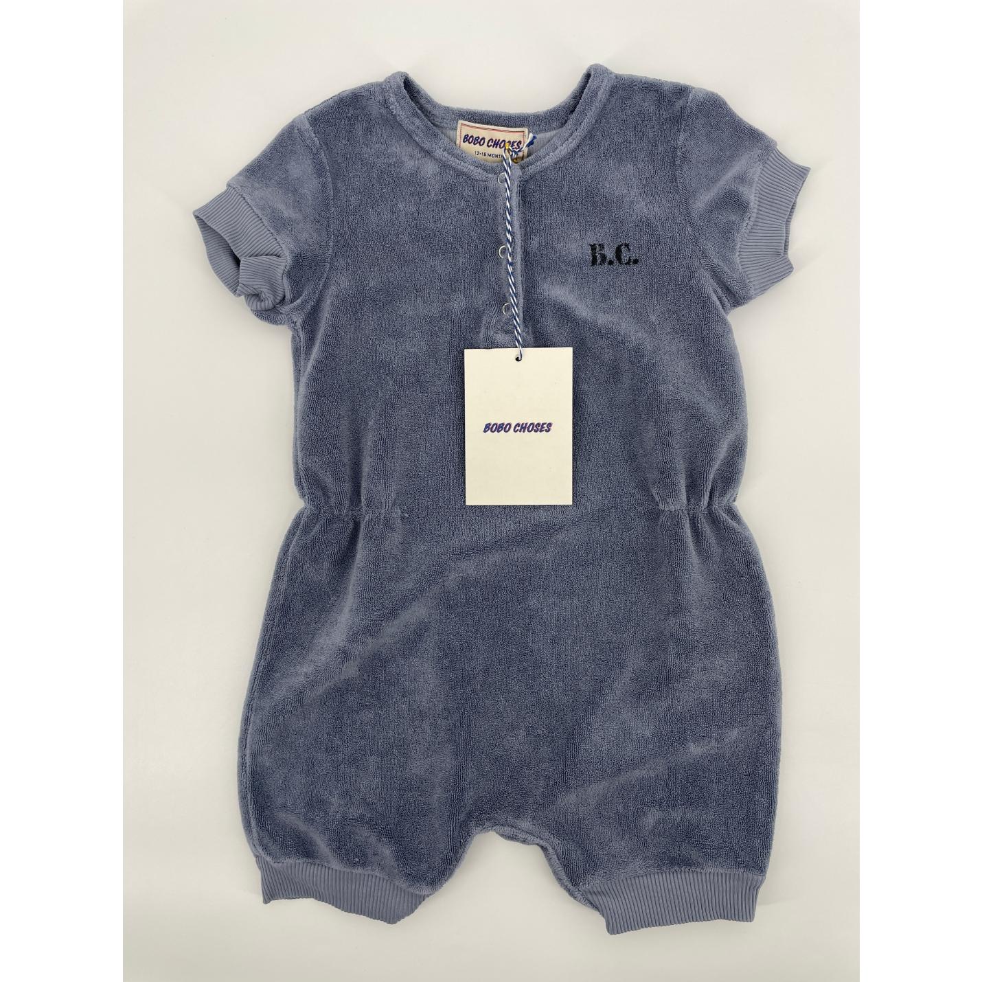 Grijze badstof jumpsuit van Bobo Choses in maat 80 / 86 met op de rug een grote print van een badminton shuttle ‘poppetje’ met daaronder de tekst ‘Mr. Badminton’, zie foto’s. Hij heeft voorop een paar drukkers en geprint logo ‘B.C.’ op de borst, getailleerde taille en drukkers aan de onderkant. De korte mouwen en pijpen zijn afgewerkt met grijs rib katoen.