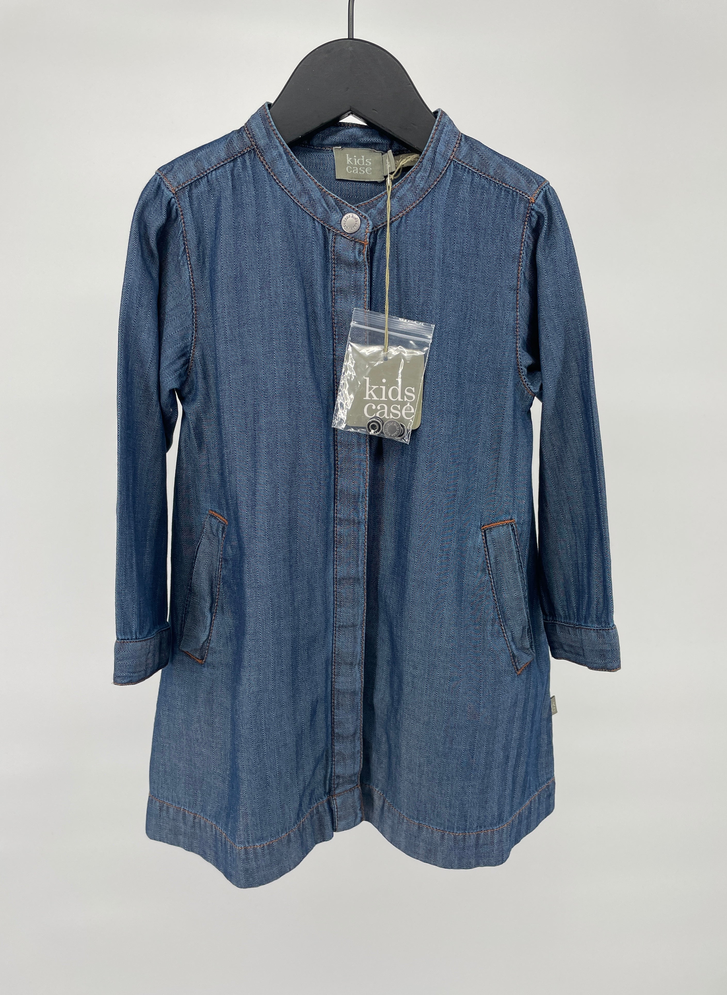 Blauw denim jurkje met lange mouwen van Kidscase in maat 86. Het jurkje heeft voorop twee zakken en sluit met drukkers die mooi zijn weggewerkt, zie foto's. Ook de mouw uiteinden zijn netjes afgewerkt met een drukker sluiting.