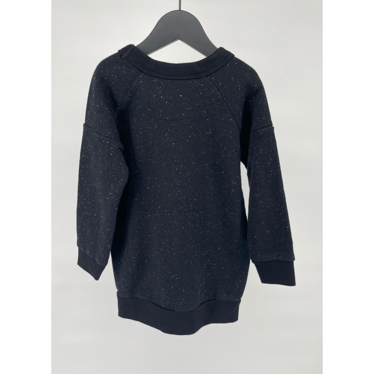 Zwart gemêleerd jurkje van Finger in the Nose in maat 92 in sweater style. Met op de borst een geborduurde donut, twee steekzakken voorop en in de boorden een duimopening, zie foto’s. Losse pasvorm, lengte tot boven de knie.
