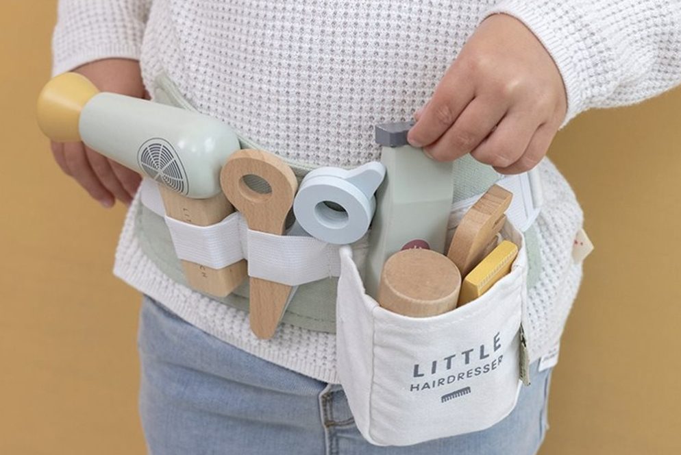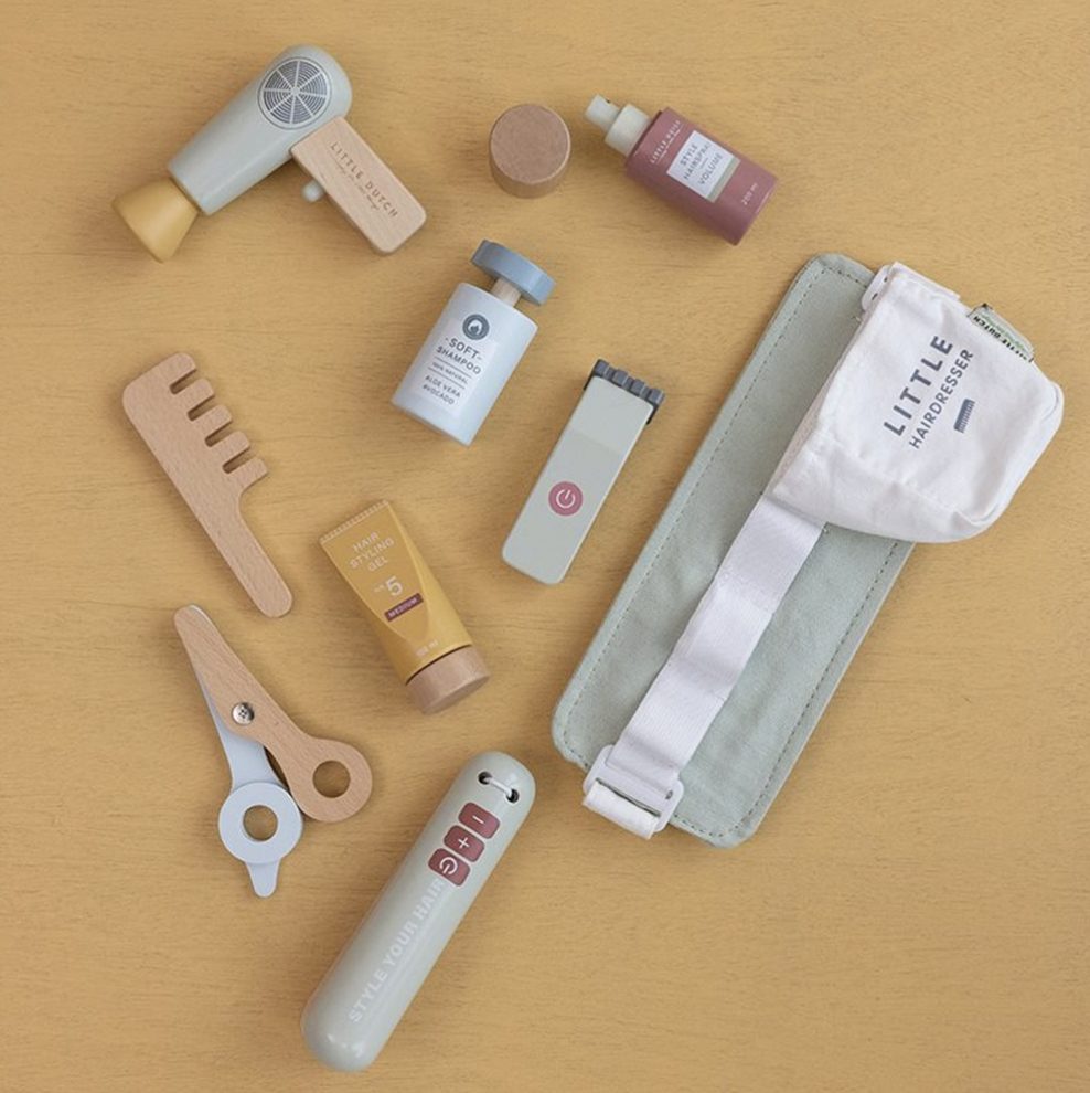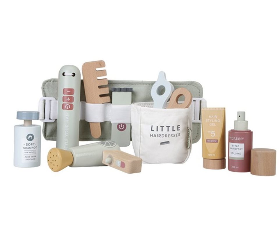 Deze kappersset van Little Dutch is het ideale cadeau voor kindjes die kappertje willen spelen. De houten set bevat verschillende benodigdheden: een speelgoedschaar, föhn, stijltang, tondeuse, kam, shampoo, haarlak en stylinggel