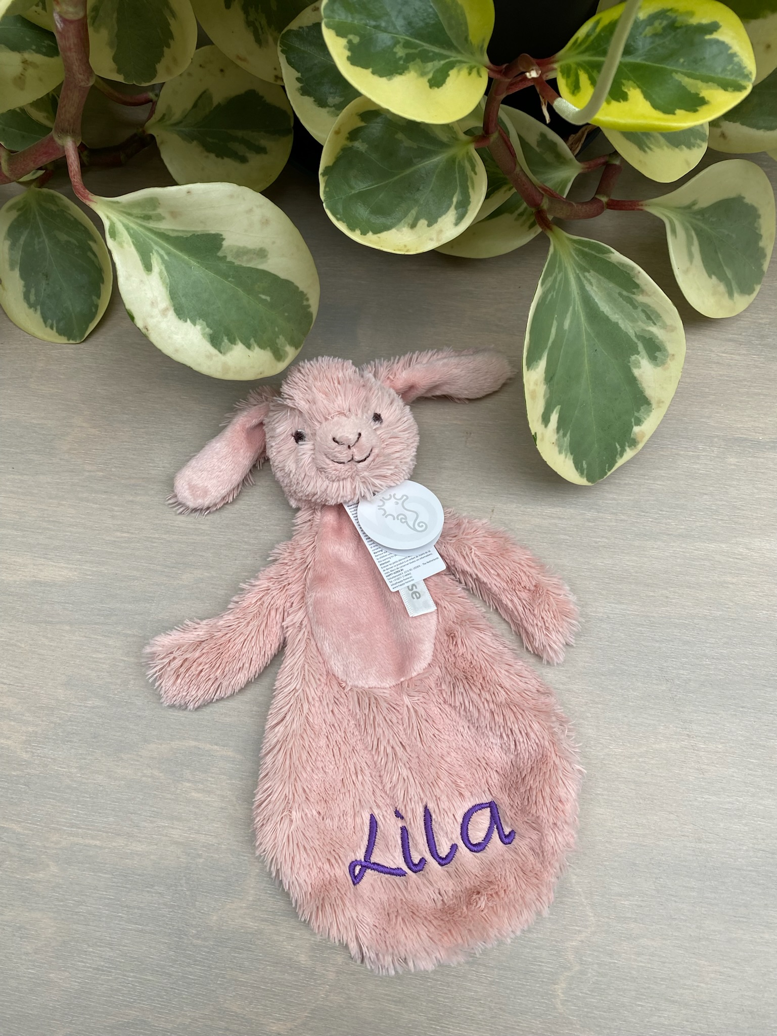 Dit konijntje vraagt erom om geknuffeld te worden! Konijn Rosi is gemaakt van super zachte stof. We borduren de naam van de baby op het doekje, dat maakt je cadeau persoonlijk en uniek.