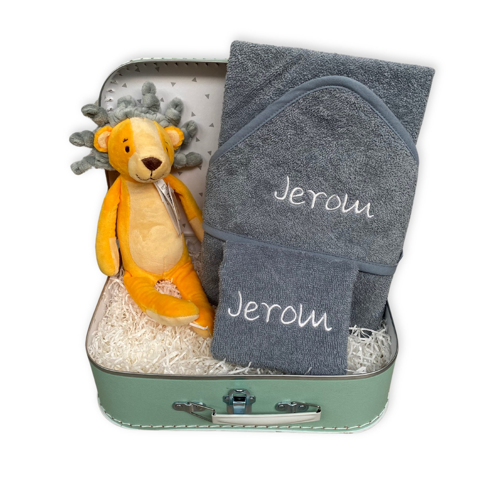 Op de foto zie je stoere knuffel leeuw Luke. Hij is ongeveer 30 cm groot. We stoppen hem in een mintgroen koffertje van 30 cm groot waar we optioneel met zilveren letters de naam van het kindje op kunnen bedrukken.