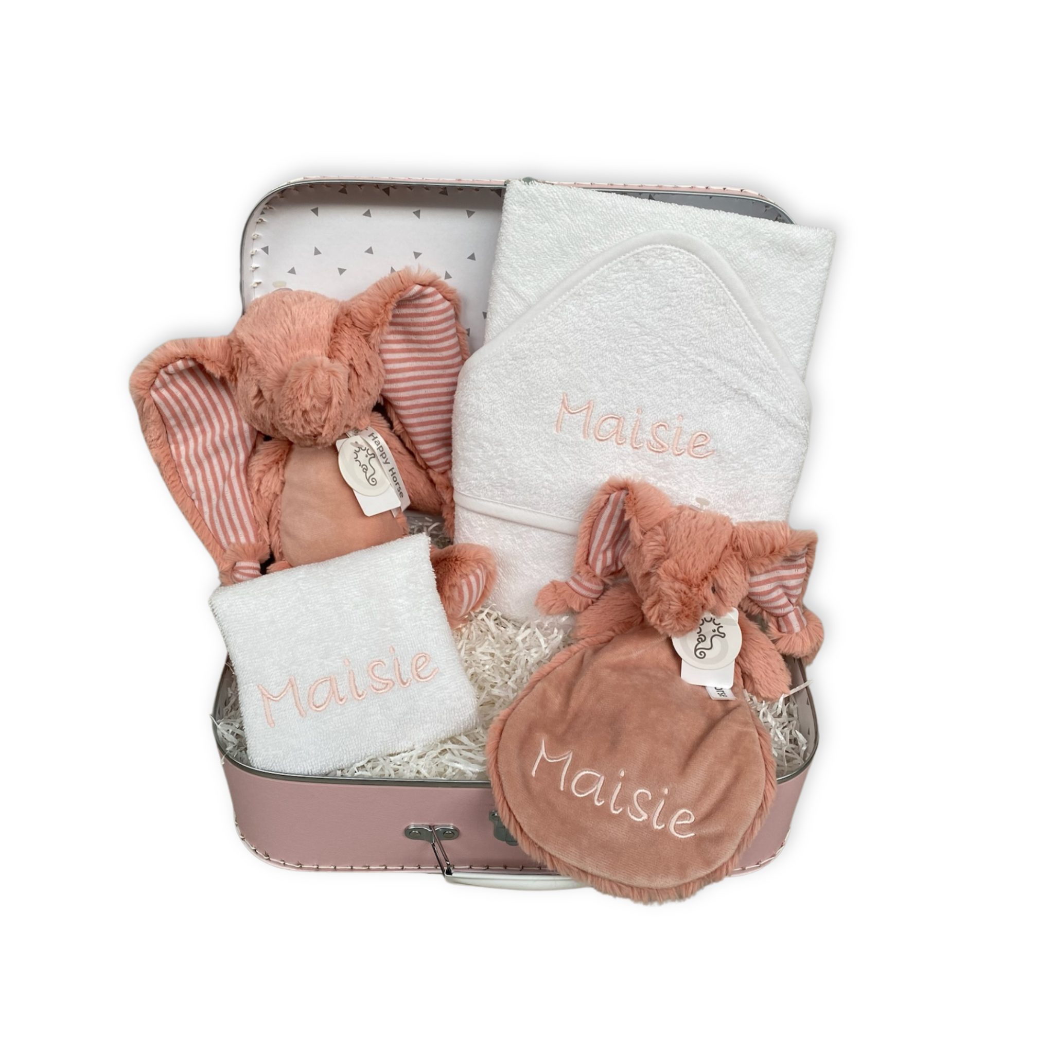 We hebben een super leuk koffertje samengesteld in zachtroze tinten. Het pakket bestaat uit een zachte badcape en slabbetje waar we de naam van het kindje op borduren. Een super zachte olifant Emily knuffel en knuffeldoekje (met naam geborduurd) van het leuke merk Happy Horse mogen niet in de koffer ontbreken. Al deze mooie cadeautjes stoppen we in een handig koffertje. Leuk om later mee te spelen of om babyspulletjes in te bewaren!