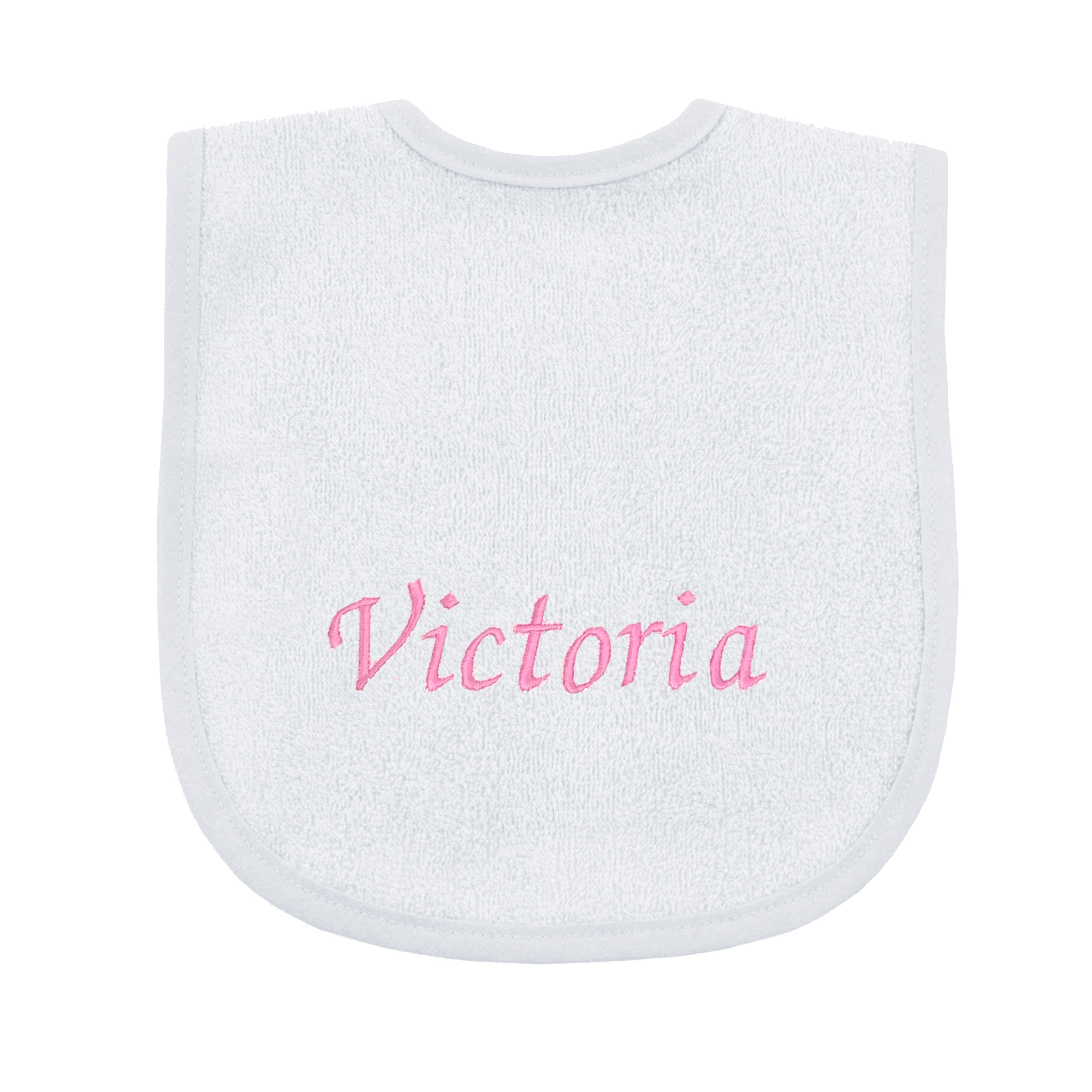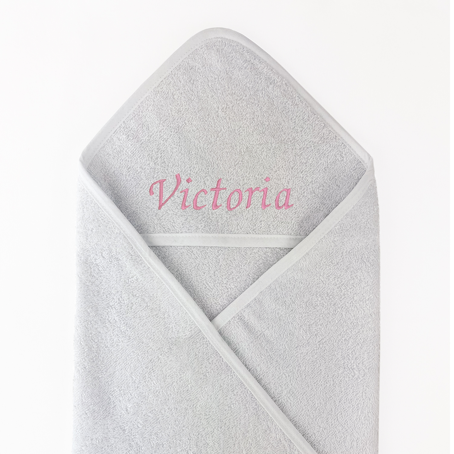 – Badcape en slab met naam geborduurd (lichtroze letters)