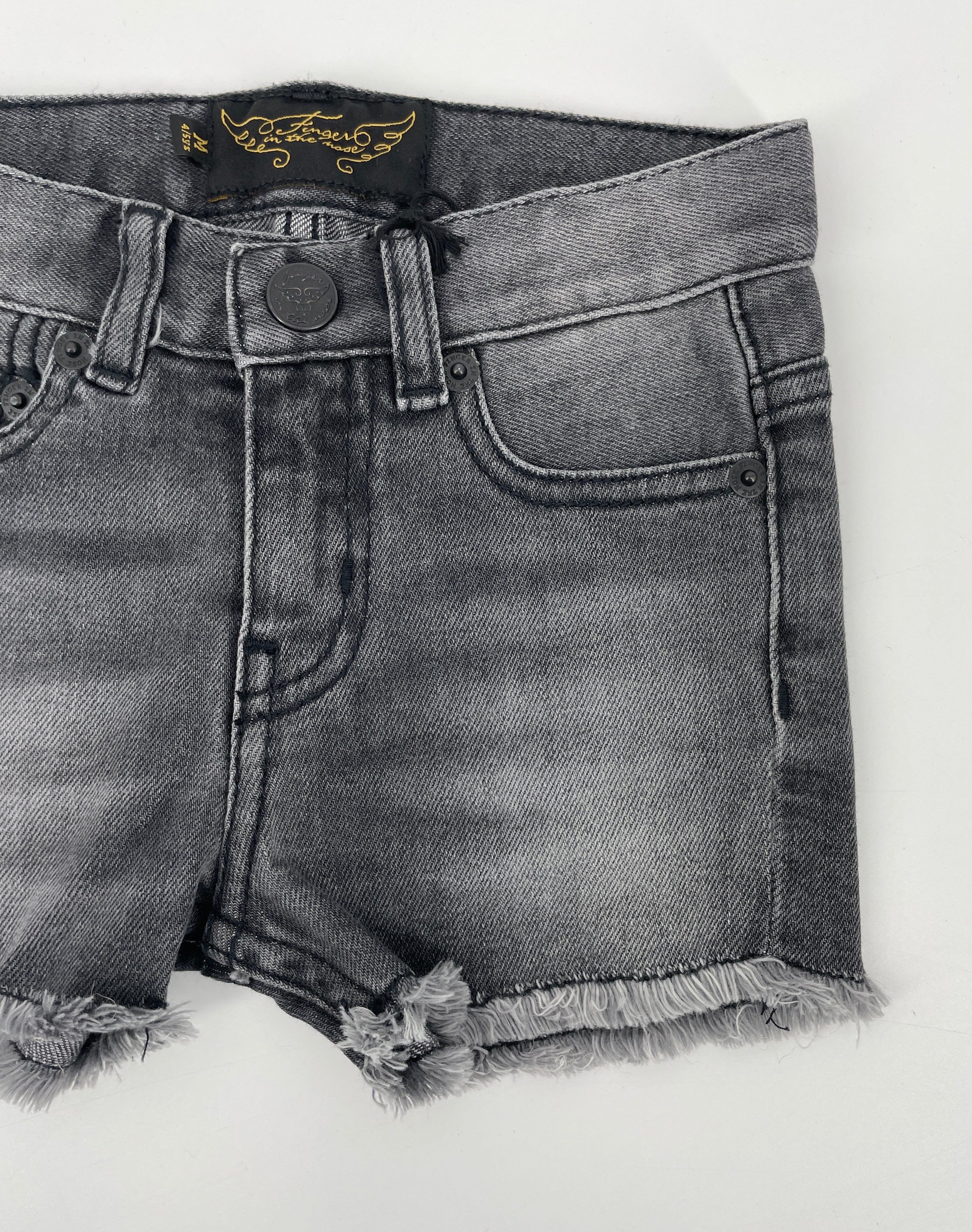 Donkergrijze korte broek met rafels van Finger in the Nose in maat 110. Het broekje heeft 5 zakken, sluit met een rits en drukker en is binnenin met elastiek verstelbaar. Op een van de achterzakken zit een zwarte merk applicatie, zie foto’s.