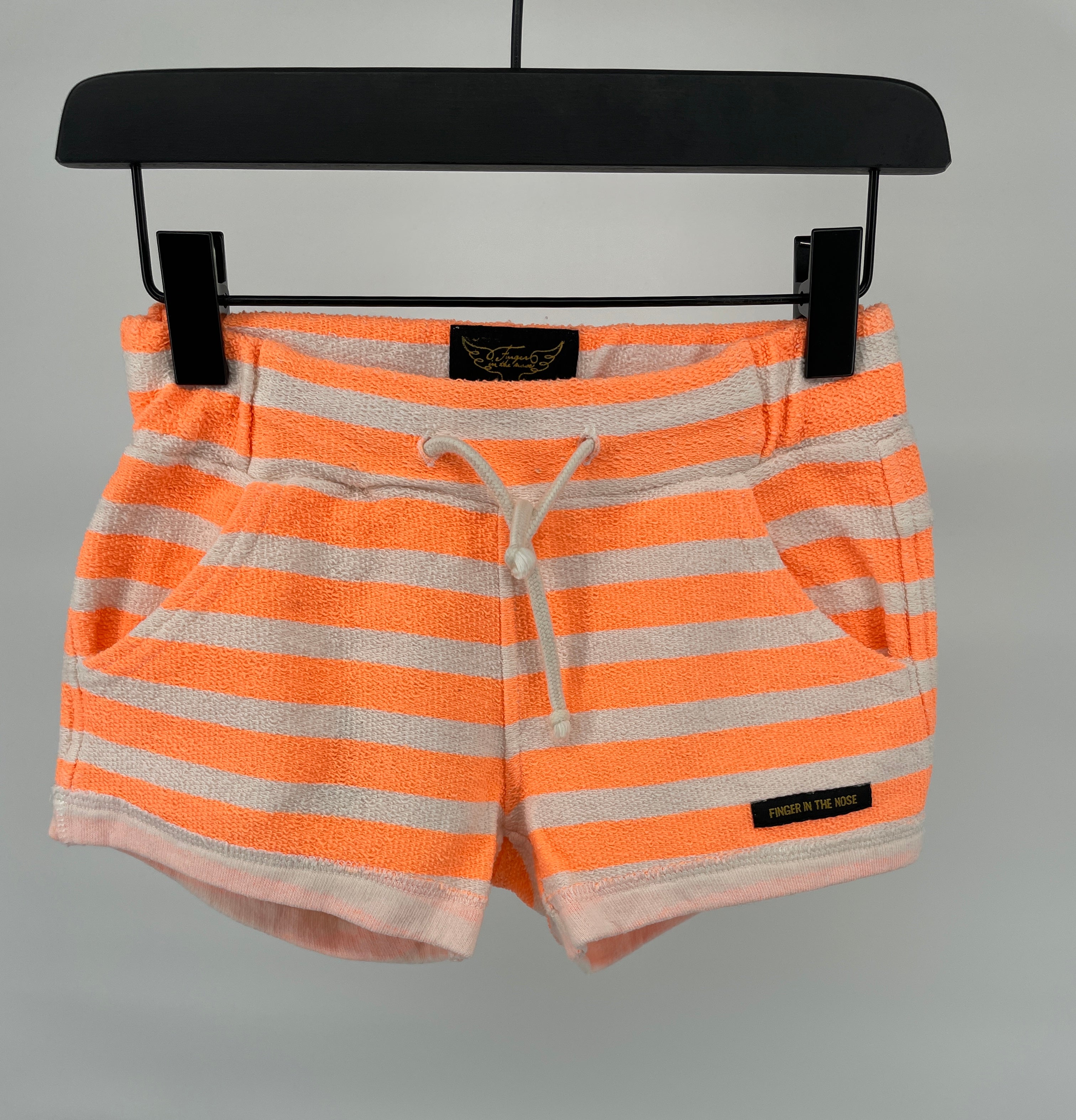 Oranje wit gestreepte korte broek van Finger in the Nose met elastische tailleband en koordje om op maat te strikken. Voorop zitten twee zakken. Het broekje is gemaakt van een soort grove badstof.