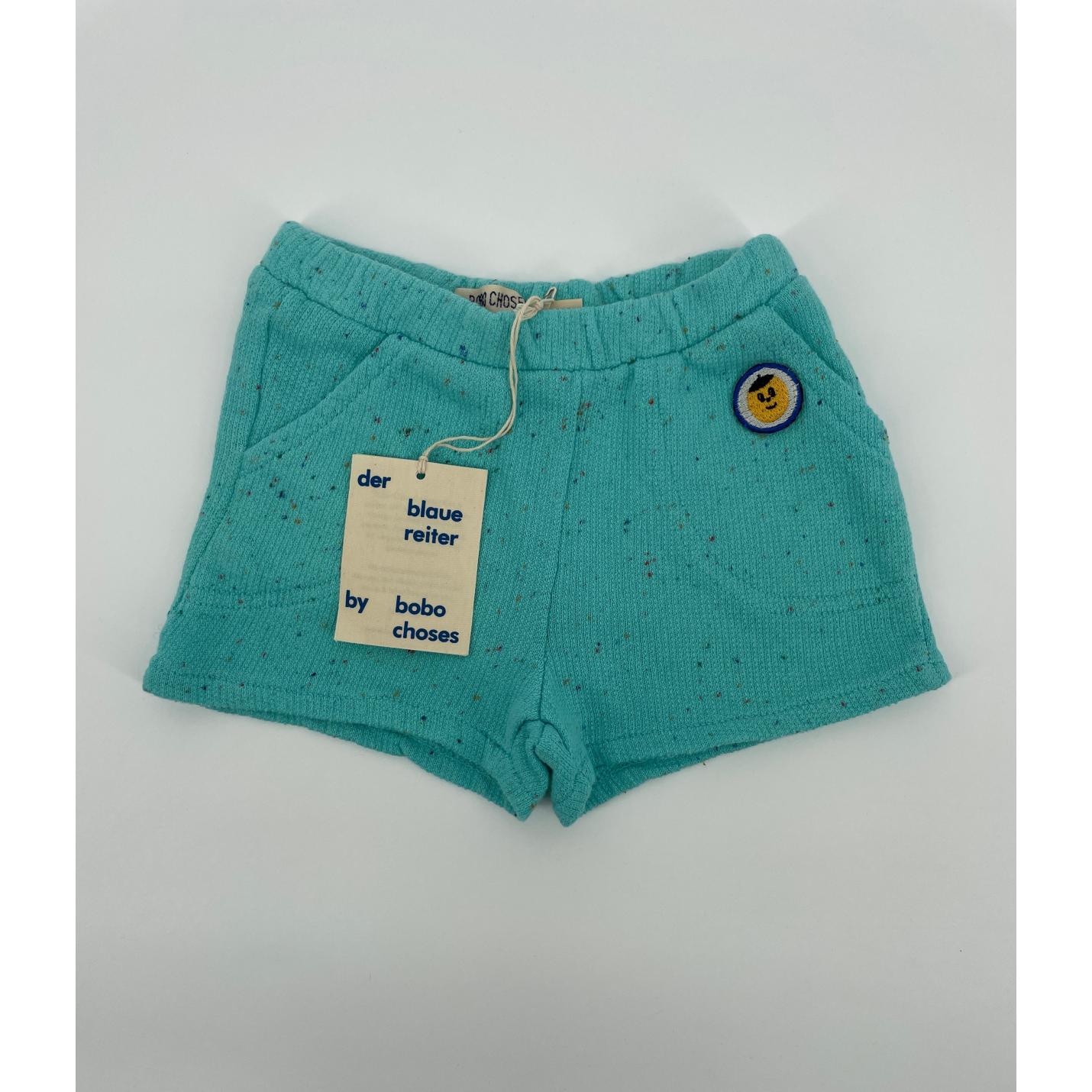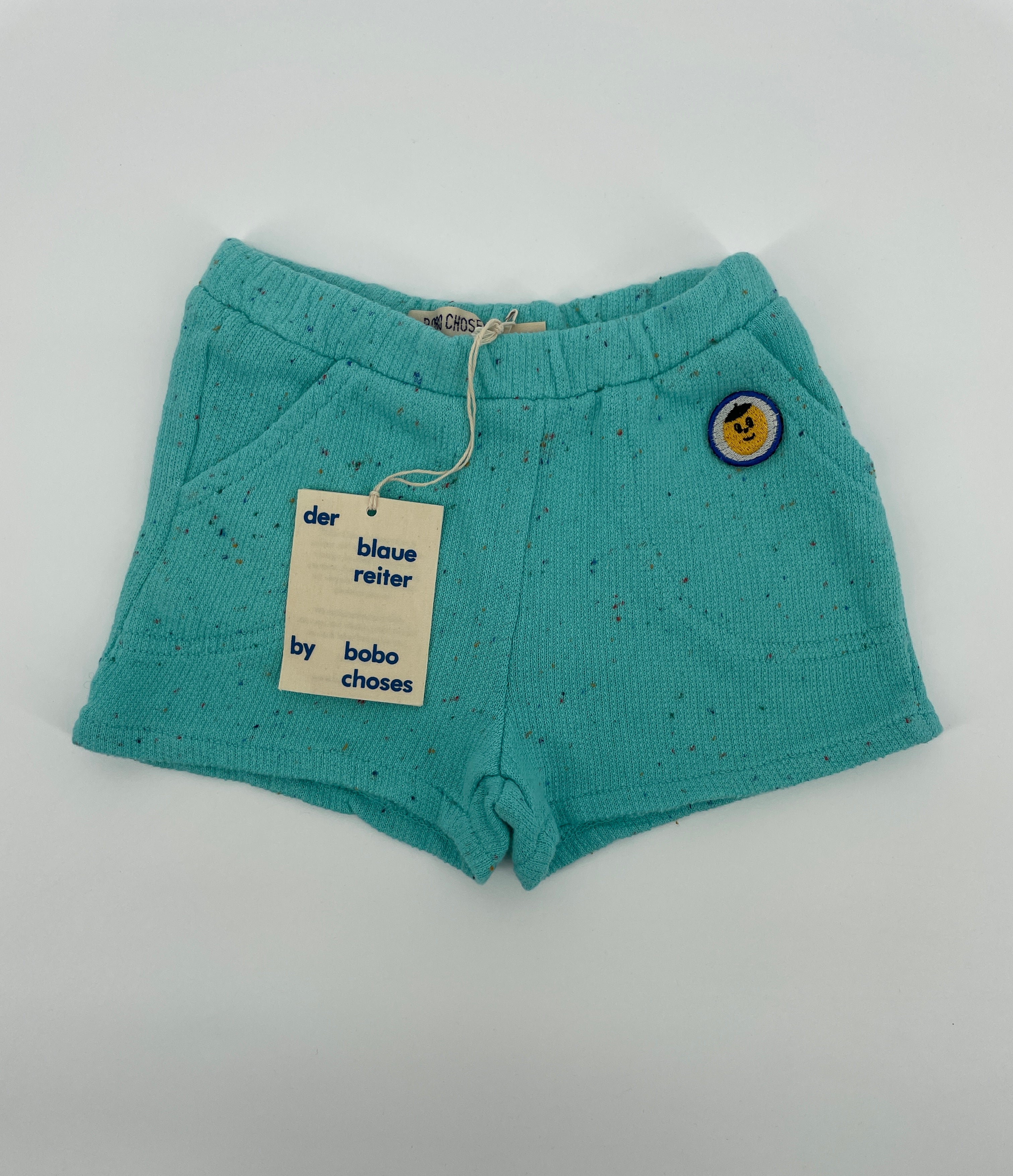 Groene korte broek van Bobo Choes in maat 80 / 86 met elastische tailleband en voorop een kleine patch van een gezichtje, zie foto’s. Voorop zitten twee zakken en achterop nog eentje. In de stof zit een klein pikkeltje verwerkt in allerlei kleuren, zie foto’s. Pasvorm: normaal, straight.