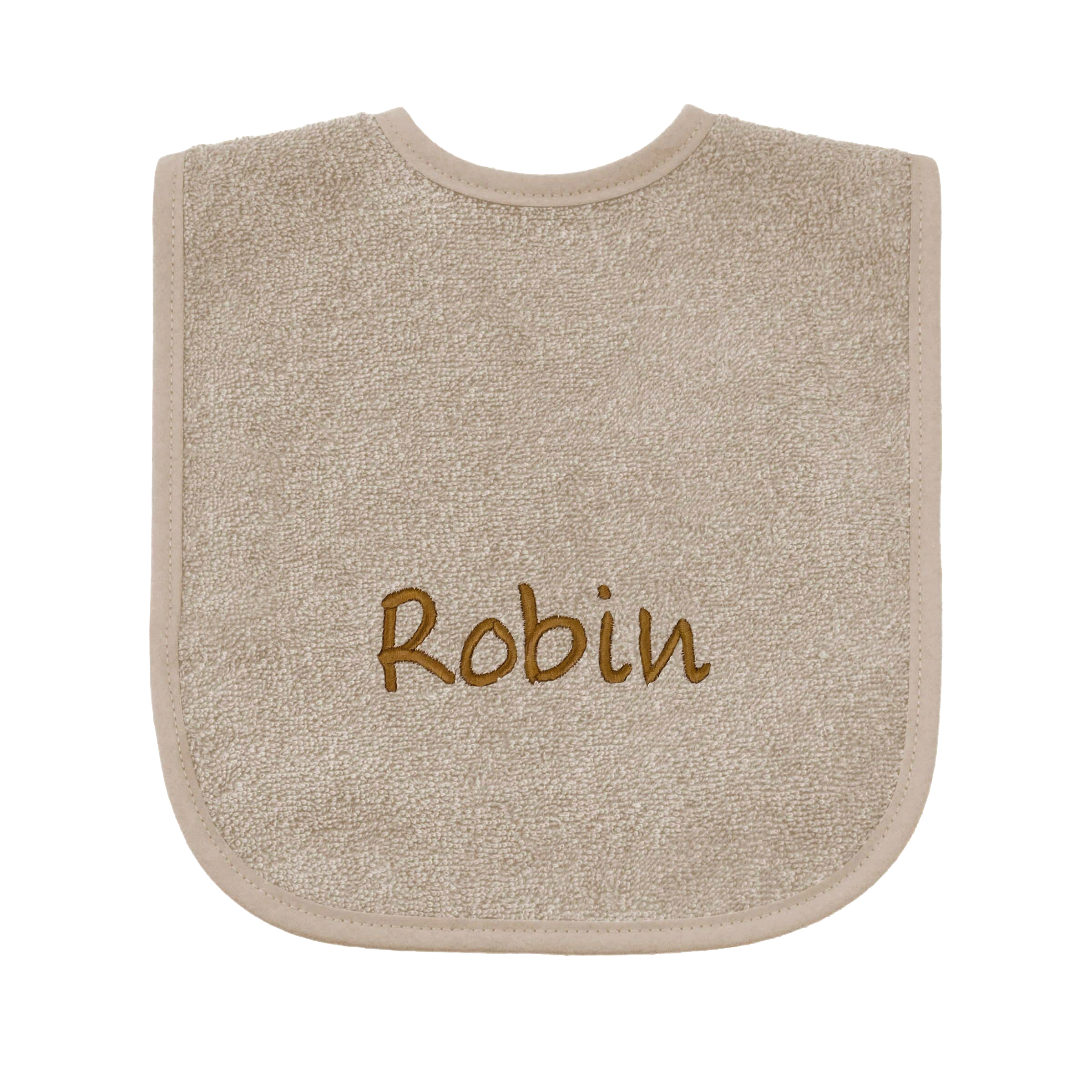 – Slabbetje met naam geborduurd (lichtbruine letters)